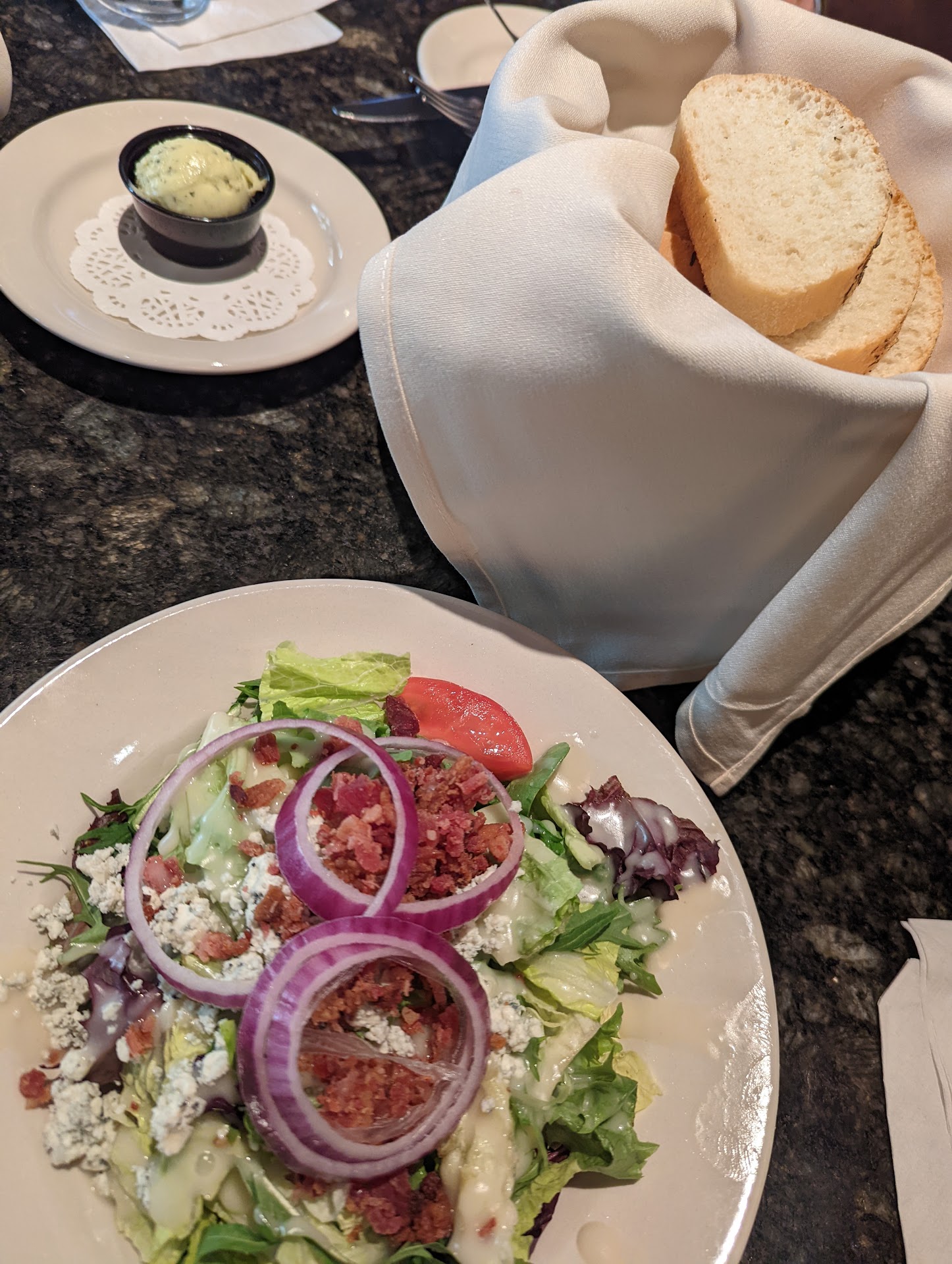 Ā Ā Ā Read moreStopped in (for the first time) for an early dinner. What I first noticed is how dark it was in the dining room. I don't mind a cozy ambiance, but this was a bit much. I was promptly greeted and seated; a server arrived not long after to take my order. I ordered the grilled salmon Oscar, which was described as prepared medium and topped with sweet crab, bearnaise and demi-glace. Let me begin with the good: The portion sizes of salmon, crab, asparagus, and red skin smashed potatoes were good. The herb butter served with the complimentary bread was also good. Now the not-so-good: Everything was underseasoned. My guess is that the salmon was prepared from a frozen state, as it was mushy and dry. Describing the sauce served with the salmon a beranaise is a stretch. It reminded me of heavy cream. No hint of shallots or tarragon, and no chervil in sight. The demi-glace was also underseasoned and too sweet, which is odd because classic demi-glace has no sweet ingredient. The asparagus and potatoes were run-of-the-mill, not bad, but lacked any seasoning. I used some of the herb butter on both, which helped. The bread tasted as if it was from the evening before. The service wasn't bad, although I did have to flag down an employee to get my check. Overall, it was a disappointing meal. I ate enough to quench my hunger and left the rest. I'm surprised by the number of glowing review. Perhaps I caught everyone on...