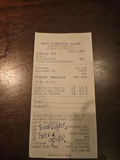 Read moreMy Sister and I waited for nearly 15 minutes before we were greeted by a woman that obviously hated her job. She asked us to give her a few minutes and disappear. The place was almost empty but many of the tables had not been cleared from the last guests. Another 10 minutes passed and I called out "Hello". Another server came and apologized and asked for a moment. She looked around....walked around ..then asked if a booth and a half would be OK. I said sure that will be fine. She leads us to a small table in a passage way in the bar area where half the booth had been removed and a chair was sitting along with an extension cord speggittied around the floor and what I think was a vacuum cleaner. She took her foot and pushed the extension cord over to clear the floor path. We sat down, my sister took the chair because I had shoulder replacement the week before and the booth would probably be easier. The greeter/server placed our menu on the table and away she went. This table was so sticky the the menus pealed off the table. I took my finger nail and slid it a bit over the table and the sludge gathered on my nail. This is what happens when a table is wiped down with a soaked bar mop and left to dry on its own... We were not thrilled about much at that point except for the thought of the lobster. My sister and I were looking forward to getting out from being cooped up and having a wonderful meal of a big beautiful Lobster that most of us have enjoyed so many times at Red Lobster. We discussed asking the server to wipe and dry the table and perhaps a place mat when she came back. We waited another 15 minutes. We discussed where we could get good lobster then quietly and respectfully got up and left. We then went to the nearby Bone Fish and had a fantastic late lunch and were greated and treated as valued guest. I hope you can appreciate how hard it was to write this review without interjecting the true aggravation and irritation...