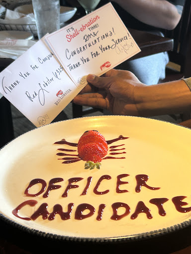 Living hours away from my brother and family, it meant so much to celebrate this accomplishment together at such a welcoming establishment. The manager, Tywana, also went above and beyond—she checked in on us, congratulated our troops, and even thanked them for their service. The staff surprised them with handwritten thank-you cards and a decorated plate that said “Officer Candidate,” topped with strawberries cut into the shape of a lobster. It was such a sweet, personal touch and made our time together even more memorable.