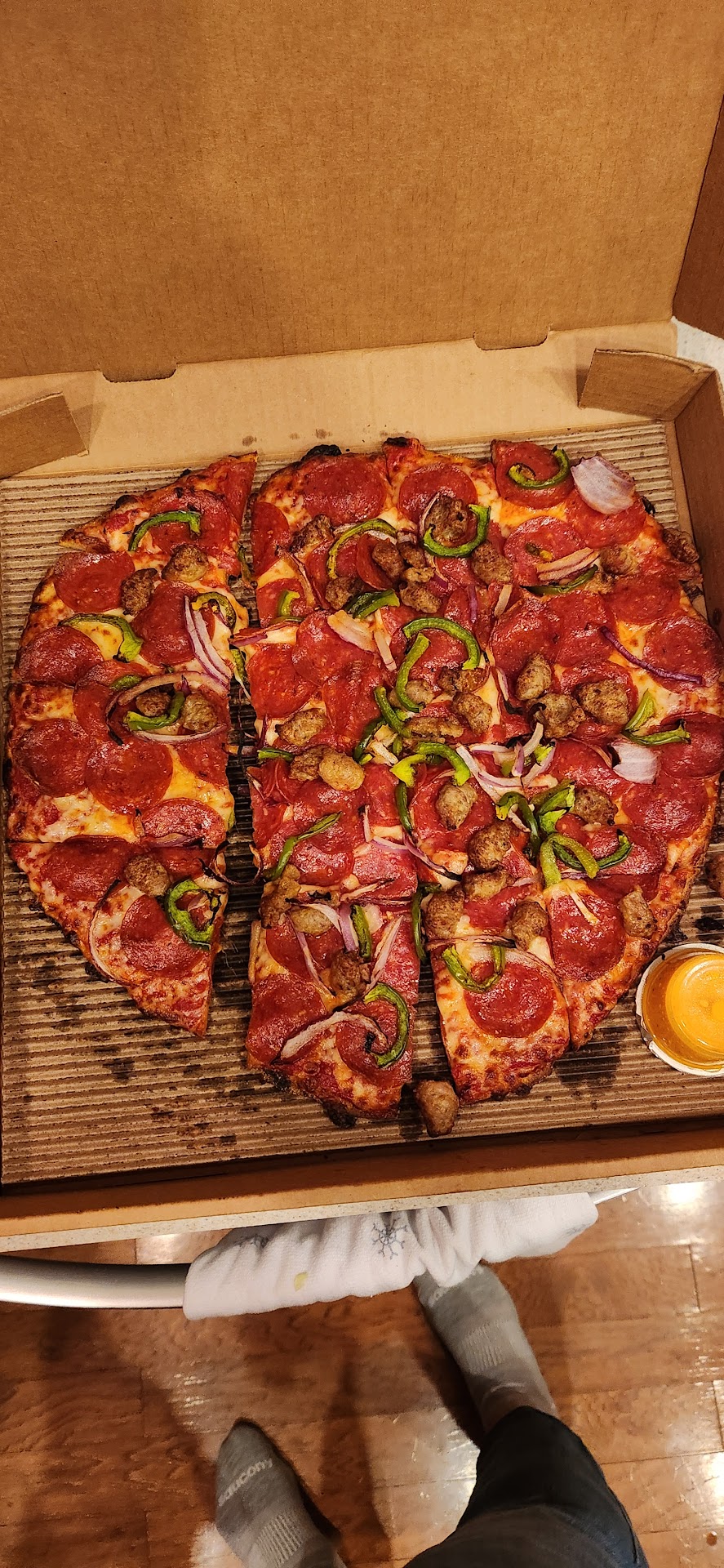 And this pizza wasn't free tonight. We had guests over that we fed, and this is what they saw, so clearly they're not impressed with Romeo's nor will they be customers there, I would imagine. I'm expecting another response from "the owner" saying they'll do better and to contact them. Gets you nowhere though! Including they never get better. Quality control is completely out the door at this location, and that comes down on the piss poor management. Hey but they're pocketing a lot more profit, as we're paying for stuff and letting them get away for not providing it. I think if everybody started being a cash payer, and not paying for the pizzas until you see them, they'll change their ways, as they'll end up with a bunch of pizzas sitting there that nobody will take. Somebody makes a pizza, and then somebody else is taking it out of the oven and cutting it. So two people are visually looking at these pizzas and knowing that they did not even come close to providing what they were supposed to provide for the money that's paid and for the product that's advertised.