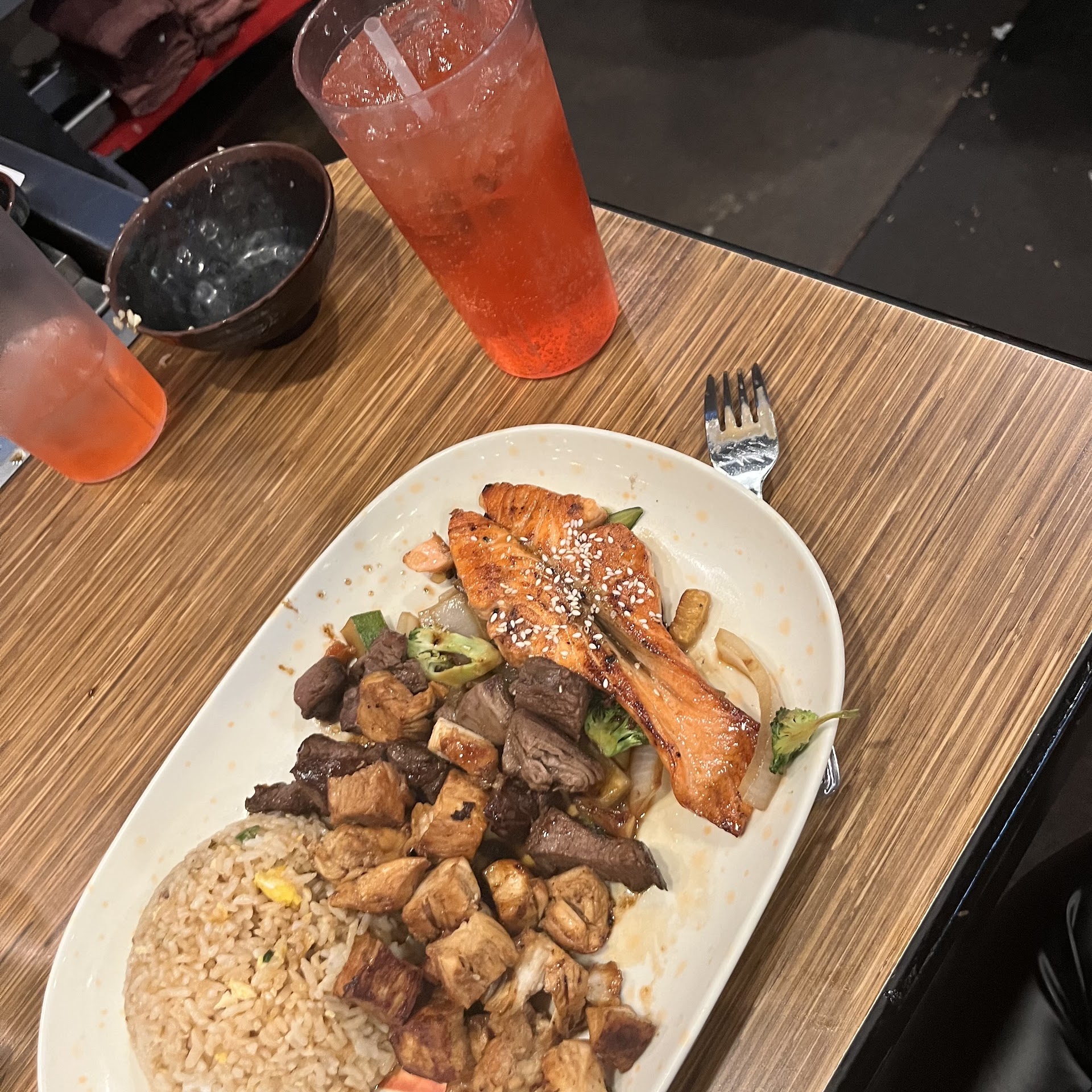 We got the "Feast for Two" which included chicken, steak, and lobster, rice (fried rice was extra) bean sprouts, veggies, shrimp appetizer, soup, and salad (and a drink and a ice cream that was never given or offered to us). The hibachi chef was fairly entertaining and good. The food was average but still ok. Our server was just average, nothing impressive, just doing a job and we could tell he wanted to get back to his phone. We did not get the drink OR the dessert as advertised to go with the meal.