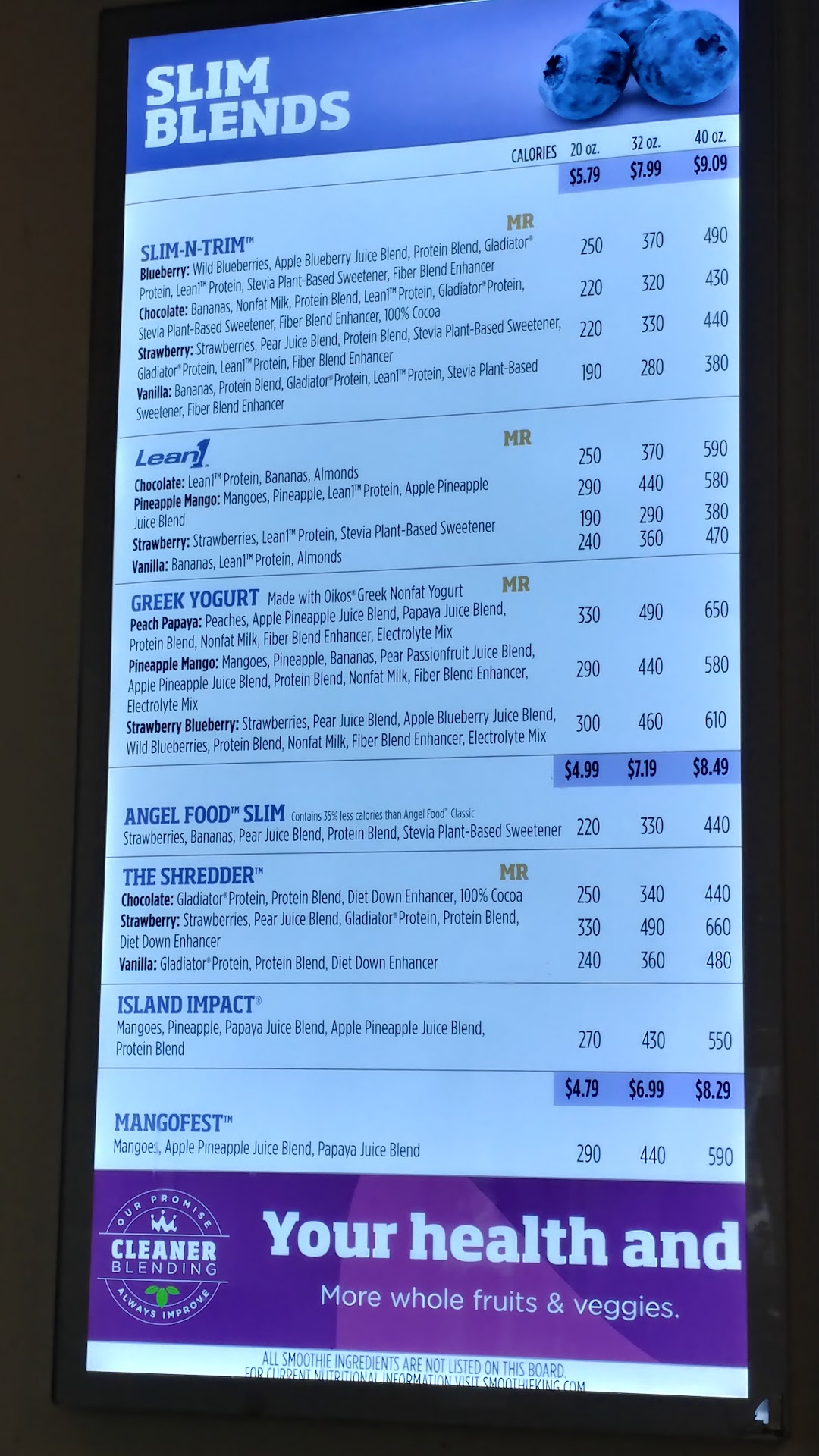 Read moreOriginally gave this location 4 stars but since last fall their quality seems to have drastically dropped. I typically get the Chocolate Peanut Power Plus, and the last 5 - 6 times I've ordered it from this location it has not been blended well. It has been grainy from the protein powder or too viscous to even use a straw until melted. My friend ordered a Pineapple Recharge and it was a peach color and didn't taste right. I've ordered this a few times at other locations and it was always a vibrant yellow. Today I got another Choc. Peanut Power Plus, and it is grainy again, in additoin there are chunks of ice in it. I ordered one at the Gahanna / Morse Rd location last night, and it was made with none of these issues.