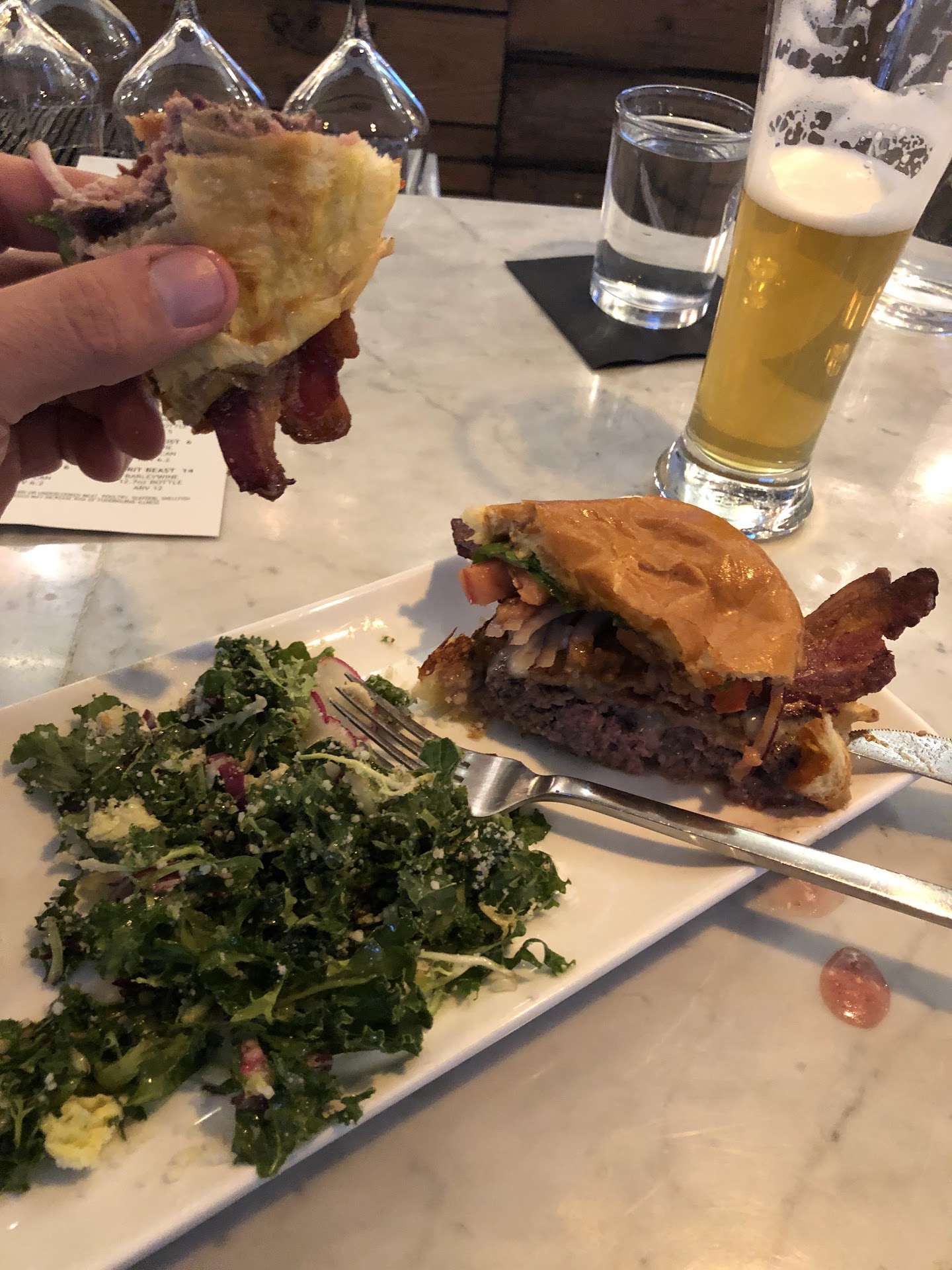 I sat at the bar and waited ten minutes before receiving so much as a drinks list. This occurred before the dinner rush, with two other patrons at the bar who had already been served, and less than a half-full house otherwise. Side conversations were had between bartenders and other employees in the meantime. To be fair, it seemed like the bartenders were making drinks or otherwise busying themselves the entire time. However, when a friend of mine later sat down and called out to one of the bartenders for a specific drink, they received it immediately. Perhaps the era of polite midwesterning is over for Columbus, and I shouldn't feel bashful to loudly insist that I be served as soon as I sit. Perhaps the utility of a pointed finger and loud voice are now preferred over expectant eye contact.