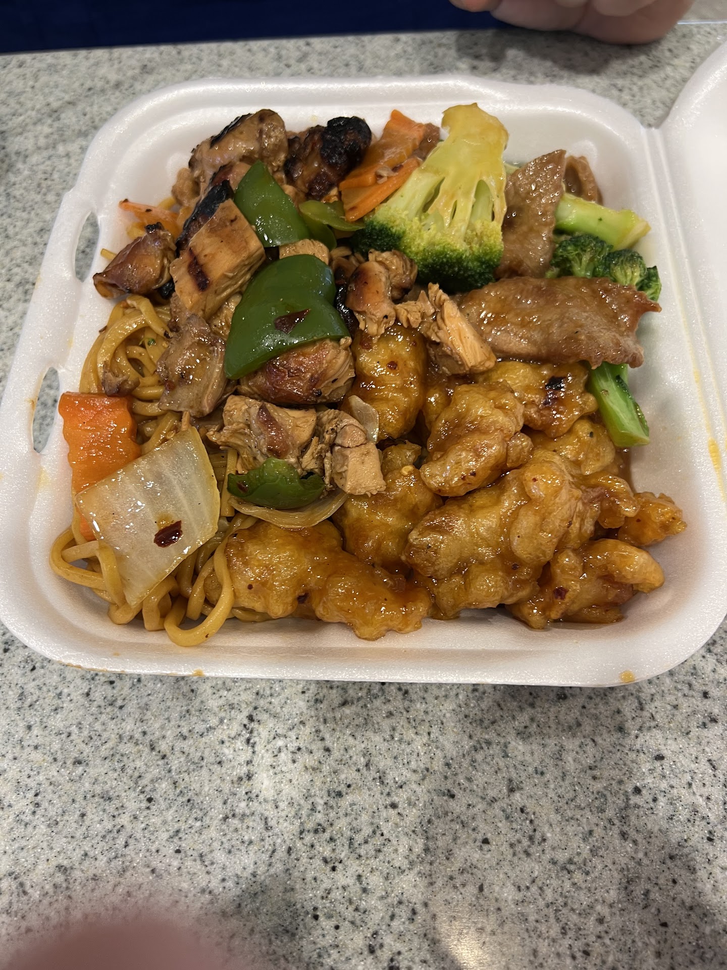 Went in to get takeout after visiting family and we got Orange Chicken with Steamed rice, Mongolian beef and lo mein, lo mein and General Tso chicken.