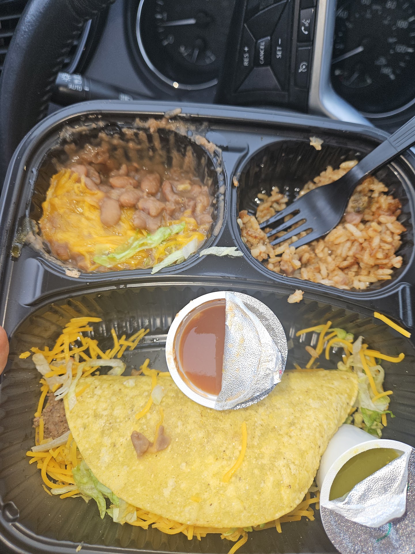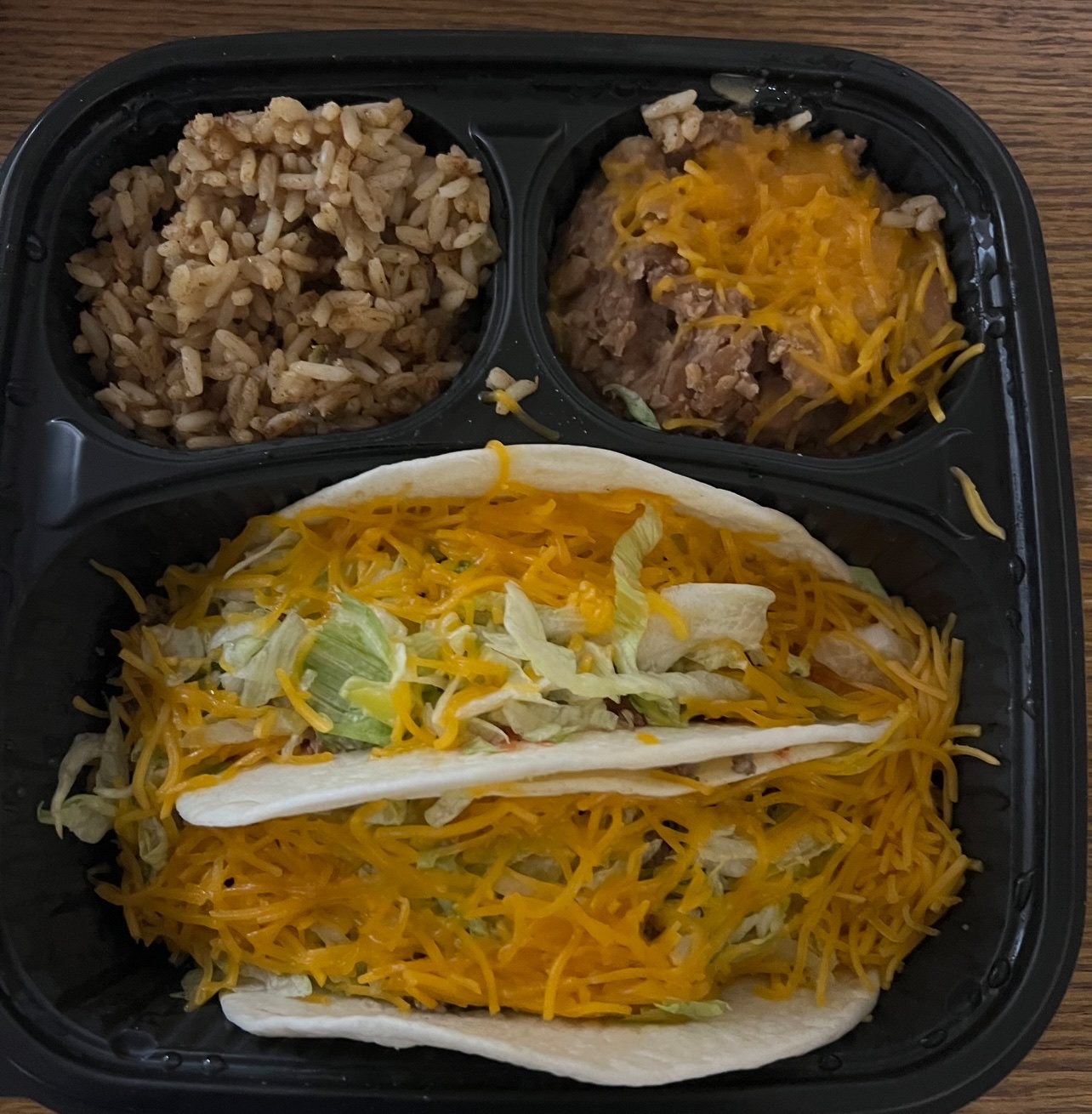 Even after a 20 min drive home, the food was still HOT The soft tortillas were fresh. The beef was seasoned perfectly. Perfect ratio of meet lettuce and cheese. The side of refried pinto beans was tasty, the rice was good, just not a rice person.