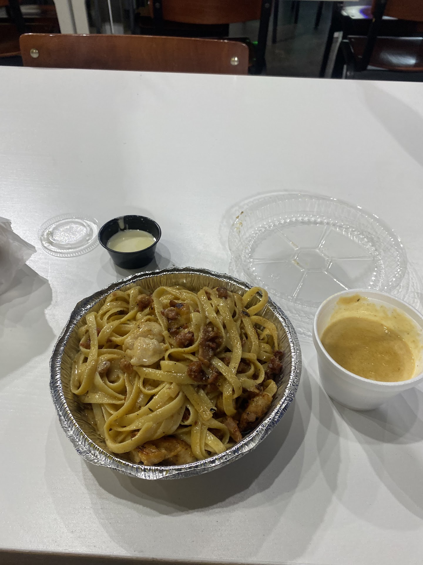 Read moreThe service was good, the lady was very polite and welcoming. The food came out pretty quick, but the taste of the food was not good to me. I ordered the fettuccine pasta with alfredo sauce, chicken, and bacon. The majority of my chicken was undercooked, I had about 5 big pieces of chicken that I had to pick out due to the undercooked texture. I also ordered the philly cheesesteak egg rolls, i absolutely did not enjoy them whatsoever. The meat tasted completely rotten in a way, it wasn’t seasoned deliciously, and the egg roll wrapper tastes like it was old. It all tasted like it was just frozen. Also, it wasn’t super hot. It was lukewarm, you would think it’d be smoking piping hot but it wasn’t. I paid $22 so I was pretty upset with my meal. I usually eat any and everything, and I always take leftovers back home, but this was just not good at all. It was my first time here but I just don’t think...