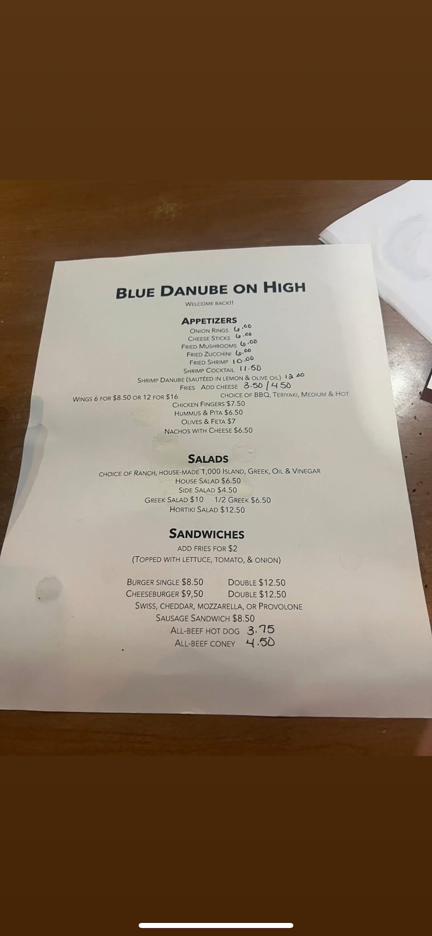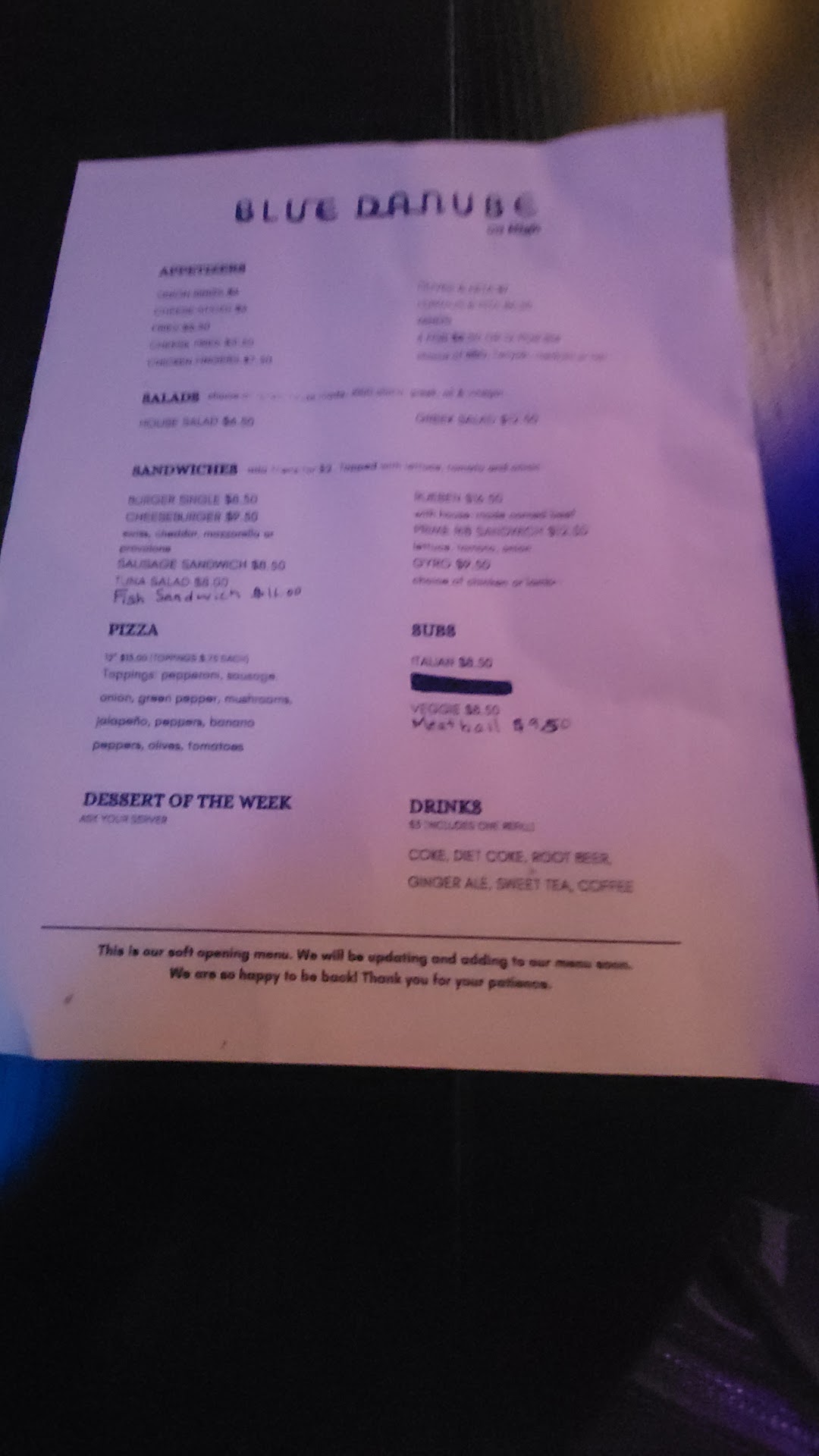 My review of the new Dube: I didn't get as far as a meal. I called to place a take out order and was told I was looking at the wrong menu. "Where do I find the new menu online?" I asked. She said she didn't know... the other girl, who is the manager, knows but she's not there. Ok-a-ay... "Well, do you have sandwiches?" "Yes" she said I told her I'd like the chili-dog. She screamed, "This is not the old Blue Danube! You're looking at the old menu!!" Me-" Nobody there knows how to find the new menu? " Her- "I already told you the girl who knows isn't here! You'll just have to come in!! " Me- "You are so right. This is not the old Dube. In all of the 35 years I ate there I was NEVER spoken to so rudely!"
