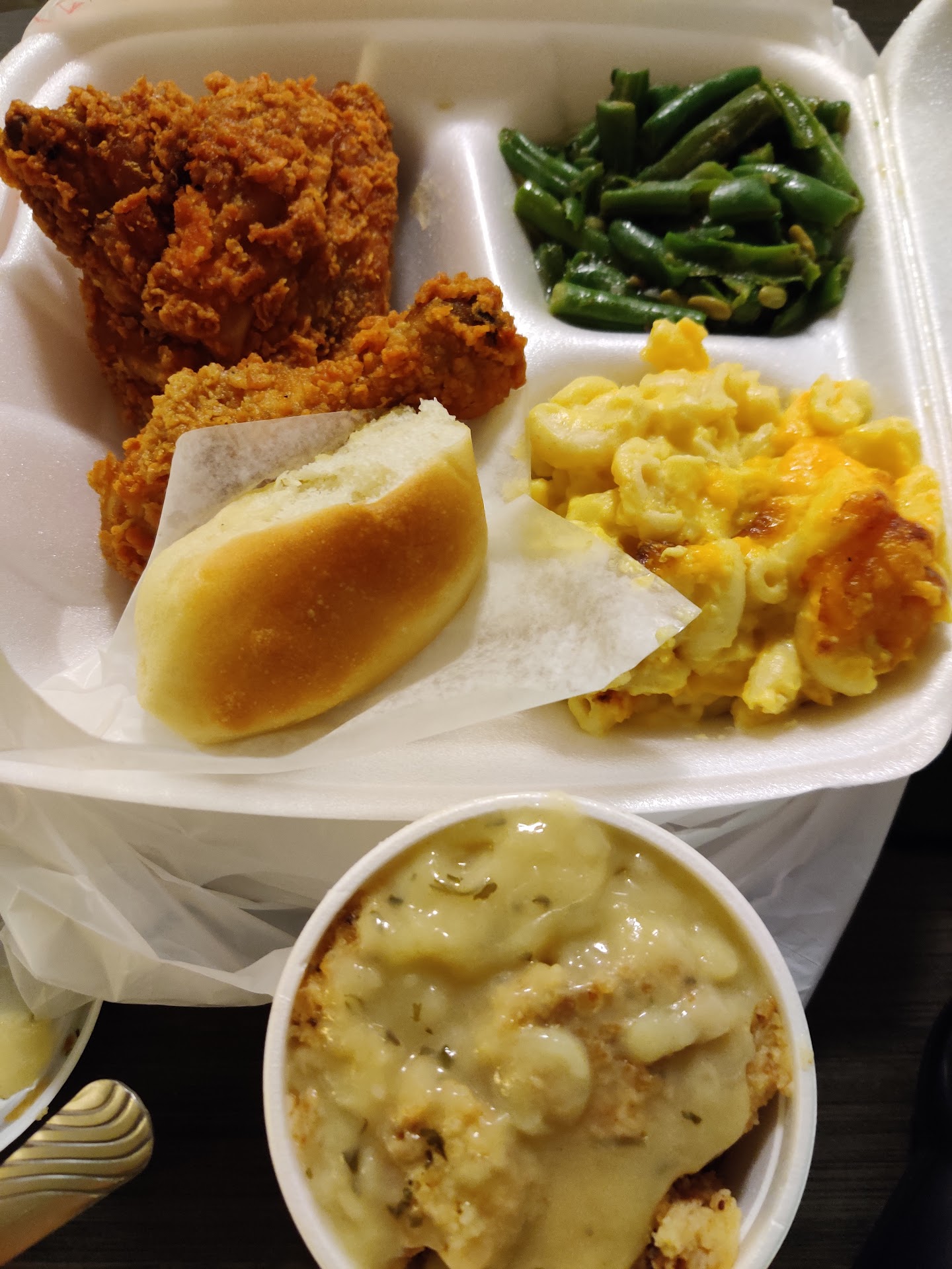 Read moreMan oh man! Where do I start? It was a Saturday when me and fiance tried their food . I got the fried chicken, roll, collards, dressing w chicken gravy and Mac and cheese. All of it was so good, no doubt! My fiance got the BBQ chicken with the same sides with the jalapeño corn bread that day and he recommended that I complete this review w 5 stars lol . Day 2 of trying this lovely restaurant I didn't order from here but fiance insisted . This time he got the baked chicken with green beans potato salad Mac and cheese and dressing. Mind you I helped him eat his sides lol I loved it and so did he. whispers they even give you cranberry sauce for your dressing, good GOD! The potato salad was with red skin potatoes and perfectly made ... none of their food is over seasoned which is good for people with high blood pressure or dietary restrictions.