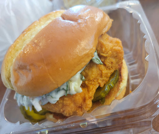 My husband found multiple bones in the breast and out of the two pieces maybe had a few bites of chicken. My tenders ⌠itâs like Hot Chicken Takeover: the meat is dense, thick, and dry with a little moisture. I donât know if they have the same supplier? It just seems off. I also have expectations of anywhere setting out plastic cutlery for it to be easy to cut into. I only ate half of one, and a quarter of the way grabbed the ketchup for flavor.