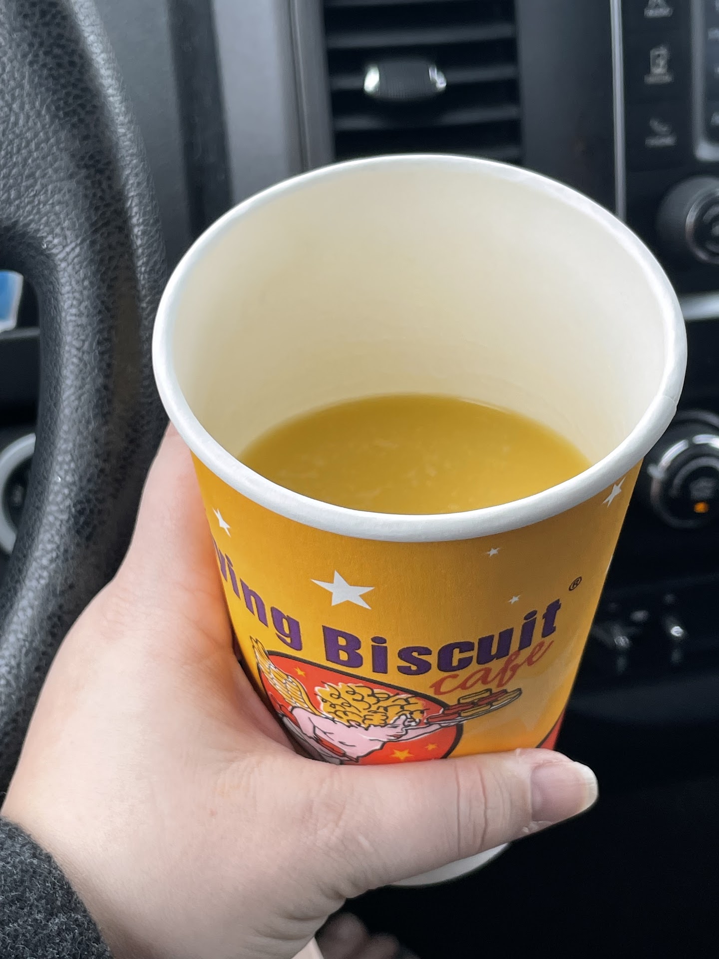 Pics: I have small women’s hands. This is not large cup. Your cup gets filled for a large OJ with “no ice” to about the height of my thumb in the second pic for a large to go. I didn’t drink from it yet. The amount of juice is maybe a small yet you get charged for a large. Then they look at you like you’re dumb if you want no ice...