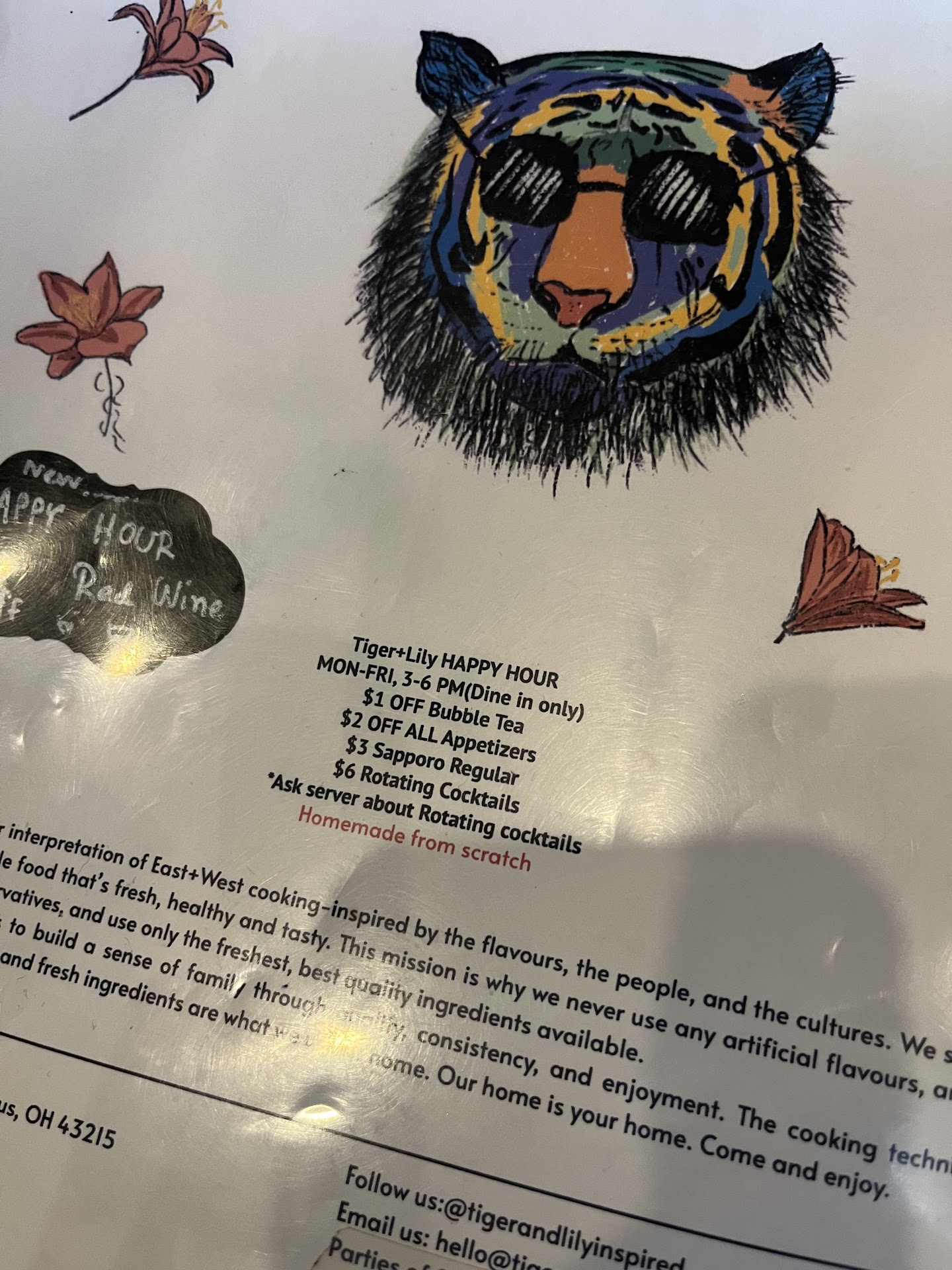 Read moreFood was meh. Maybe the taste is good, but I can’t say it’s authentic. With a name like Tiger + Lily, I thought they would focus more on southeast Asian food. I can’t speak to parking, but the downtown area is walkable. There are restrooms behind the cashier. The restaurant felt more contemporary than I expected. Maybe it’s more lively at night because of the bar. I was here for lunch on a Saturday, and it got pretty full.