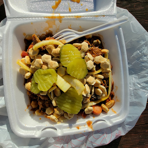The Stryker Dog - weiners, chili, BBQ, Q-onions, Q-slaw, pickles, crackers, and bbq sauce. What's not to like?