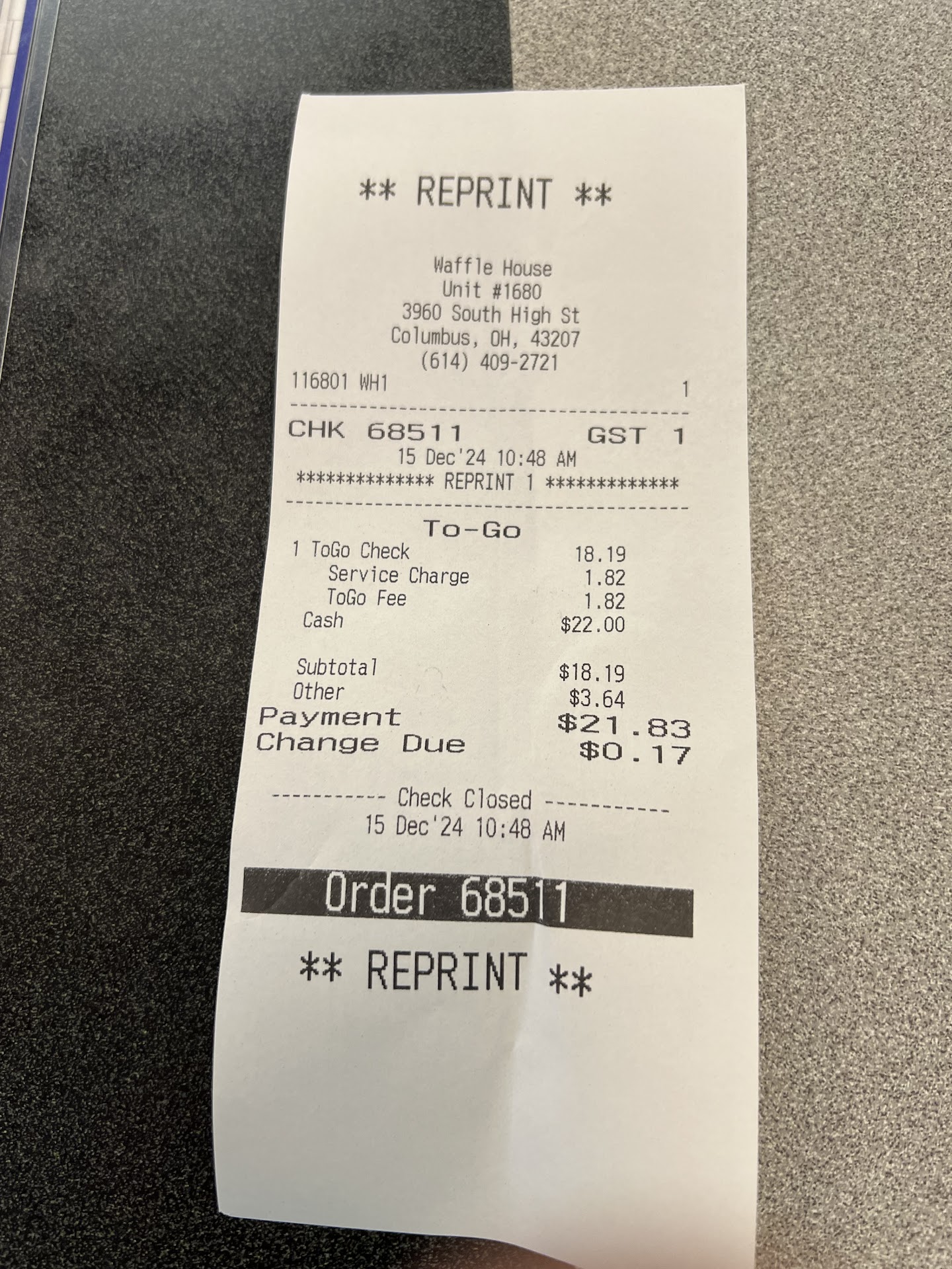 I will not be back at this location. I have worked in the food service industry for over 30 years. #1. Rudest waitress ever. You do not raise your voice to a customer or roll your eyes when they ask to be served. #2. We waited over 15 minutes for our drinks. A water and a coffee which we had to ask for 3 times and another worker brought them, not our waitress. Never got refills. Another table that came in after us, got their food when we got our drinks. #3. Brought us food that wasn't ours. #4. After our food arrived, it was cold. Obviously it had sat waiting to be brought to us. If fact another worker was having a "conversation" with our "waitress" about not picking up her food ontime. #5. Never got all our food. She said I'll be right back with your waffle. A few minutes later I saw her outside on what I can only guess was a break. #6. There was some sugar in the salt shaker. Maybe it was not her fault but I couldn't get it fixed because she was nowhere around. #7. The ketchup bottle she brought was almost empty. I had to get up and find my own. #8. The only coffee refill i got I had to walk over to the counter and ask another employee for. #9. At the register the employee who rung up our ticket did take off part of our meal, which I did appreciate. For only the second time in my life I left a bad tip. A penny. I am generally a over tipper because of my food service career. I noticed the other waitstaff would not help her. She was argumentative and mean. We called this type of waitress a "taker". Take and demand help because they can't handle their section and never help anyone else when needed or share tips or thanks for your help. You eventually stop helping these people, but it reflects on...