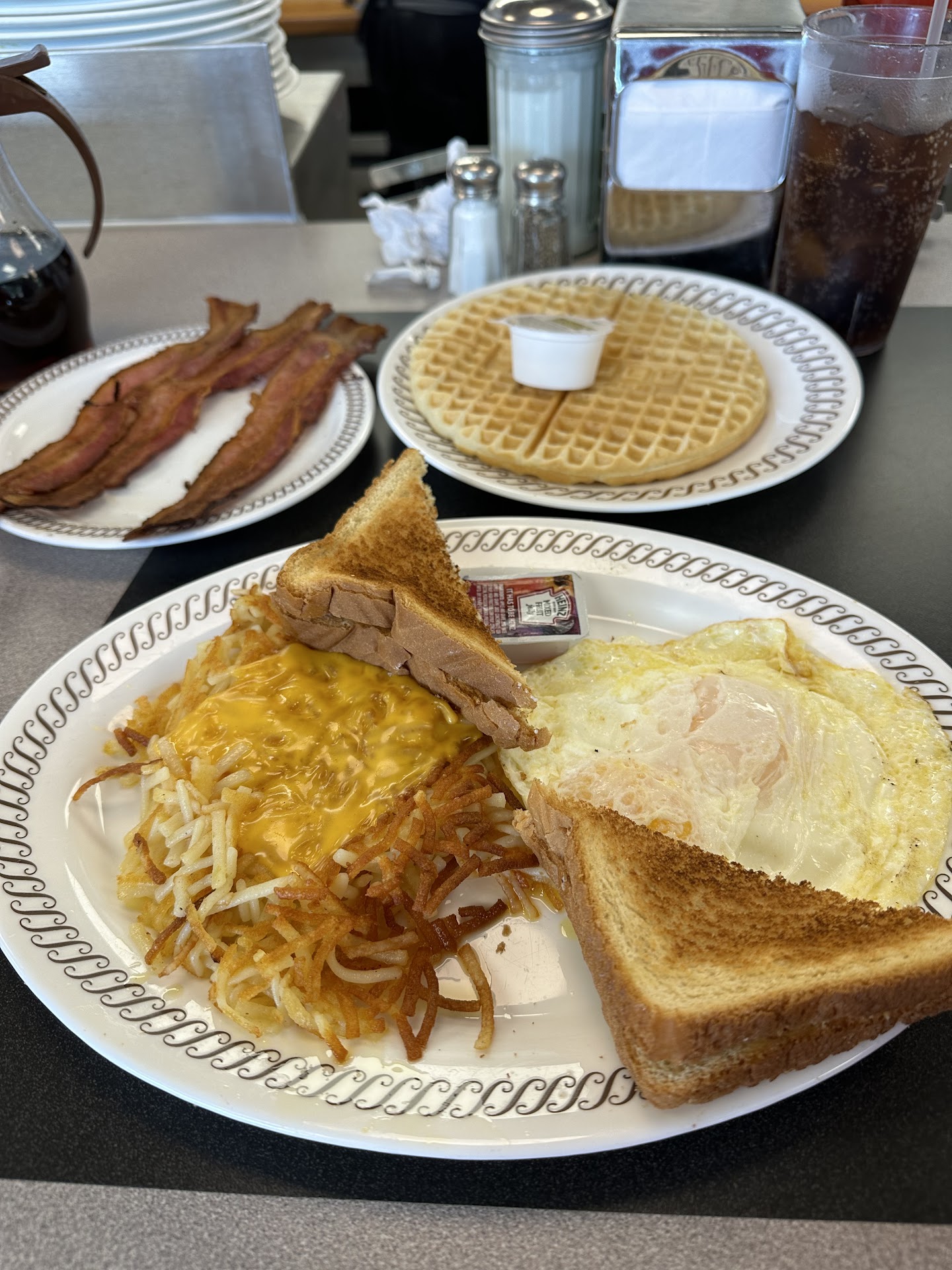 Read moreWe have been going to this waffle house for 3 yrs. Great until tonite and never going back. We each got the 2 egg breakfast. He got a LG bowl of grits and mine was a small. His came with 0 butter. Mine was literally in a pond of the butter oil they use. I had to tip my bowl and poured off enough butter to cover the saucer bottom. It was so gross. We combined our grits after that to try to even them out. It didn't matter much bc they also were not done with LG chunks smh. My over easy eggs had alot of raw white that the server seen me scooping off but said nothing. Also, our plates. Hashbrowns came on 1 plate, sausage on a plate, eggs/hashbrowns on a plate then the cold toast with un melted butter also had a plate. Round plates, not the usual oval platter. We each had 4 plates and a bowl of grits. We could hardly move! Lastly, the server brought another full coke when the 1st coke was still full. He said he wanted to top it off before he went outside! But he didn't top my glass of water? He never brought us our bill so we went to pay. He said I need your bill. I said you never brought us one, we waited 15 mins but you never came. He rustled thru and found ours. $33! 2 $10 meals with sides of grits and 1 coke. Never again! P.S, When we stacked our dishes like we always do, we found an onion on the bottom of a plate. Stuck to his hand when he picked it up. Thing is, we had no onions with our food!! So...