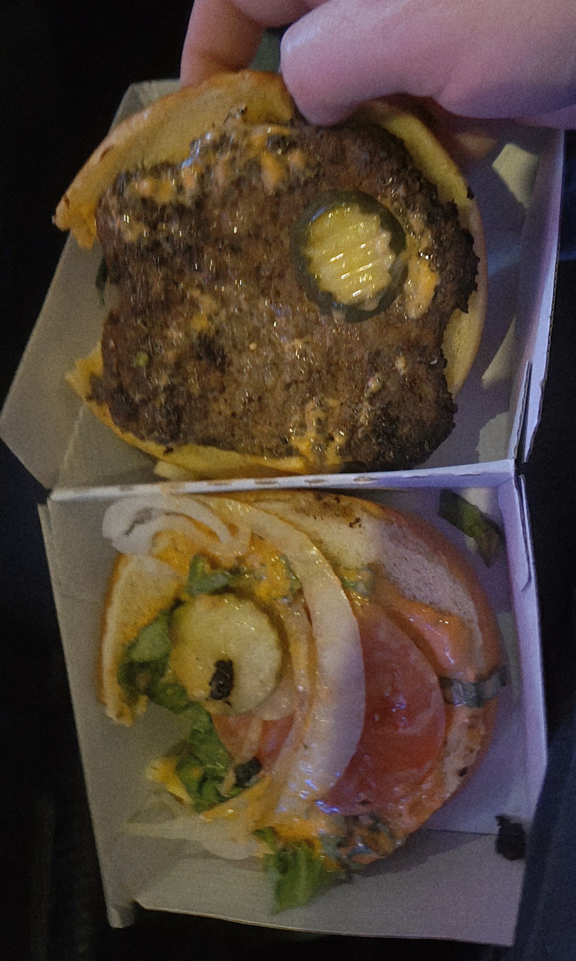Edited to add: The cashier asked us each how we wanted our burgers done. I said well- done and Hubs said medium. They both looked exactly the same in the inside....