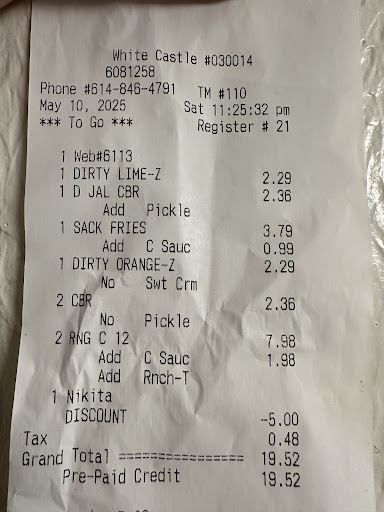 Read moreAbsolutely the worst experience I had in my entire life!!! This was my first time trying White Castle. I scheduled an online order for pickup at 10 pm inside. Because I am a visitor in Columbus, Ohio, I took an Uber to the White Castle to pick up my order. When I arrived, the doors were locked and workers inside ignored me. There is no sign on the building or in the app that says that the inside is closed. I called their phone number and explained my situation to the operator. He, however, said that the inside is closed, and he didnât want to help me. So, I walked up to the drive through window and told the server my name for the pick up order; she said itâs not ready yet (it is 8 minutes after the scheduled pick up time already). I being cold at 55 F waited outside for my order for half an hour. The server lady seeing me freezing outside had no empathy whatsoever. All the words she said were âitâs not ready yetâ and âitâs readyâ. I got home to eat the food, but guess what?! They messed up my order too! I ordered more sliders than I got, I got a smaller size drink than I ordered, and I didnât get the cheese and ranch sauces that I paid for. So, they practically robbed me (on top of making me suffer in cold for half an hour). The White Castle is a joke!