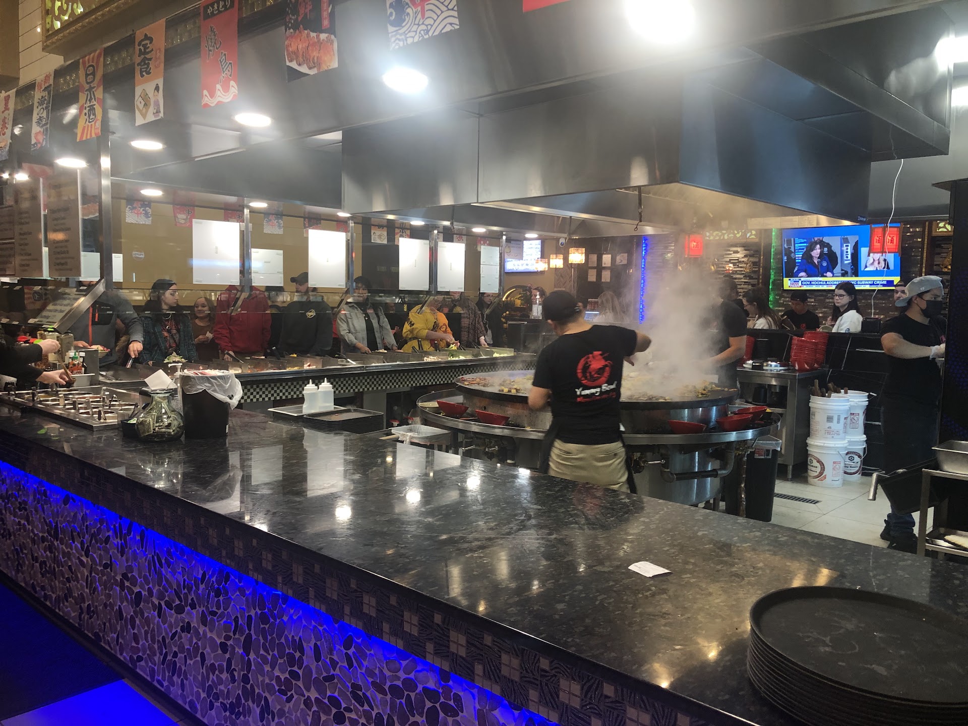 The process is genius. You sit down, order a drink (I went with a pepsi because I live dangerously), and then they hand you a bowl that practically whispers, “Fill me with greatness.” The buffet itself is a sight to behold: an all-you-can-imagine lineup of raw proteins, veggies, sauces, and toppings. You want beef, chicken, shrimp, AND tofu in one bowl? Do it. Add a splash of teriyaki, some garlic sauce, a mountain of mushrooms, and a sprinkle of sesame seeds? Go wild. This buffet isn’t just food; it’s a sandbox for your inner flavor architect.