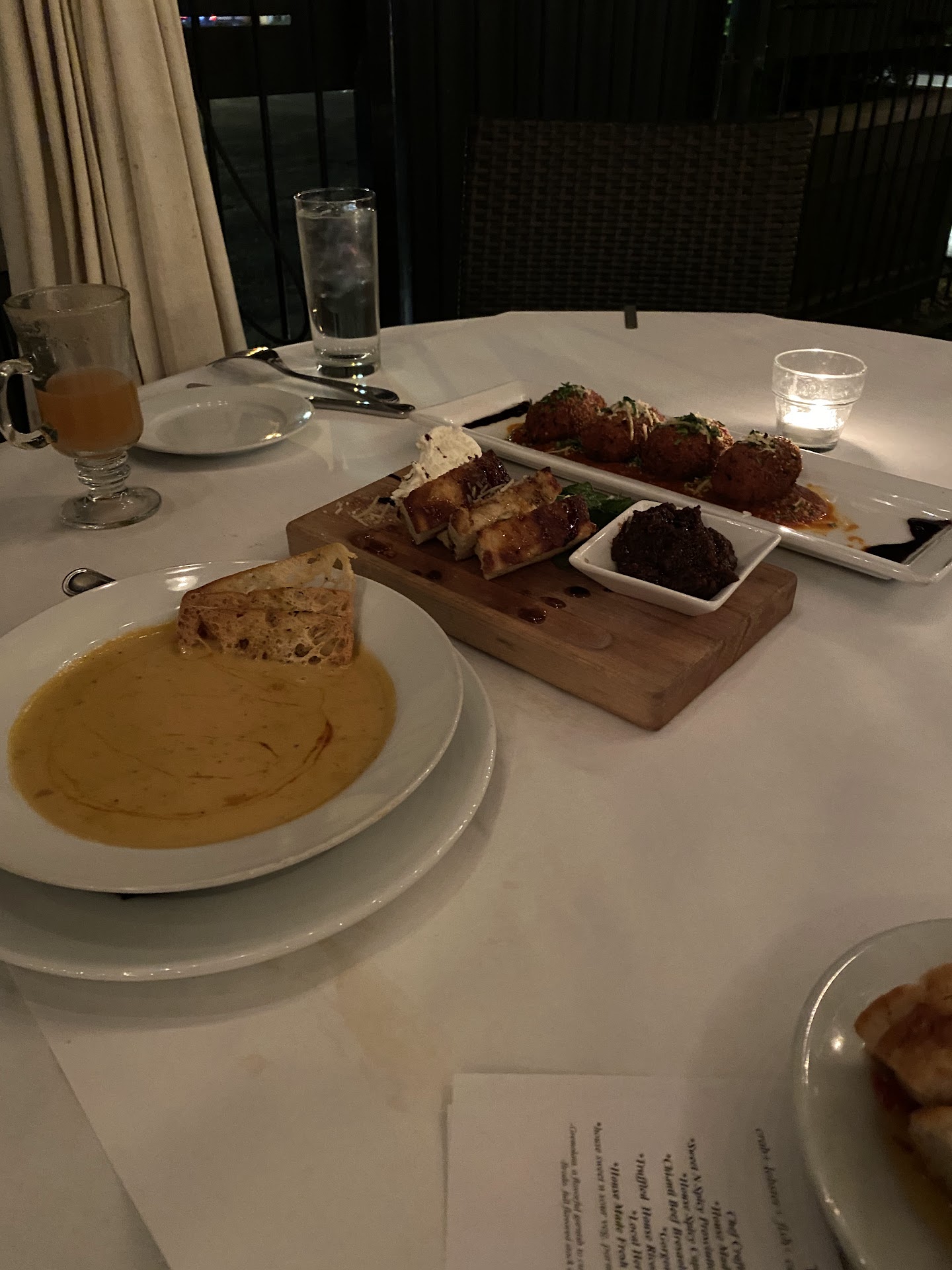 Read moreAppetizers were the highlights for me! The soup was complex in flavor, but simply put delicious. It was a creamy, butternut squash soup with notes of tomato and carrot. The bread with the ricotta and fig and balsamic complimented well, my only note would be that the portion of the fig was a lot compared to the four pieces of bread provided. The stuffed Parmesan risotto fritters, were my absolute favorite, with a slight note of spicy that added to the variety of the appetizers and m as de them all compliment one another seamlessly. We had a warm apple cider drink which tasted like apple pie and a caramel macchiato cocktail which was equally as tasty if you are a coffee lover and a fan of Baileys! It’s worth noting that the house bread they bring you (not pictured) is addictive. They’re small, proportionate bites in oil and sun-dried tomatoes, the bread is soft with a bit of an outer crunch and by far the best complimentary bread I have ever had. For our main course we chose the butternut squash ravioli, which like many of the other dishes was quite sweet. I assume that the chef enjoys balancing savory and sweet in his dishes, my only note was this dish was underwhelming due to the intensity of the sweetness and the fact that our appetizers were reminiscent of some of the same sweetness. We decided to get a dessert and found those to be unfortunately a miss. The bread pudding was undercooked, albeit tasty and the cannolis were heavy handed on the orange zest. Overall, the patio atmosphere was nice and warm, the server was informative and we took our time talking and enjoying our dishes. I would...