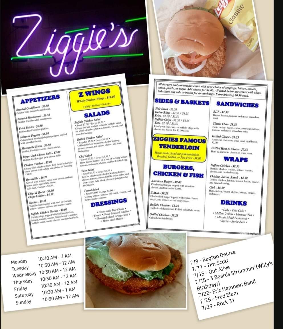 Read moreSo many people have mentioned Ziggies that I decided to check them out today. I had the Ziggies famous tenderloin and it was FABULOUS! The tenderloin was just the right size and crispy. I love crispy. It was perfect! Sean Burton was so friendly and made me feel welcome. Found out he's a bartender there, a small business owner and is running for mayor! I'm loving exploring restaurants and meeting nice people in the process! ZIGGIES is located at 3029 National Rd. It's in the same shopping center...