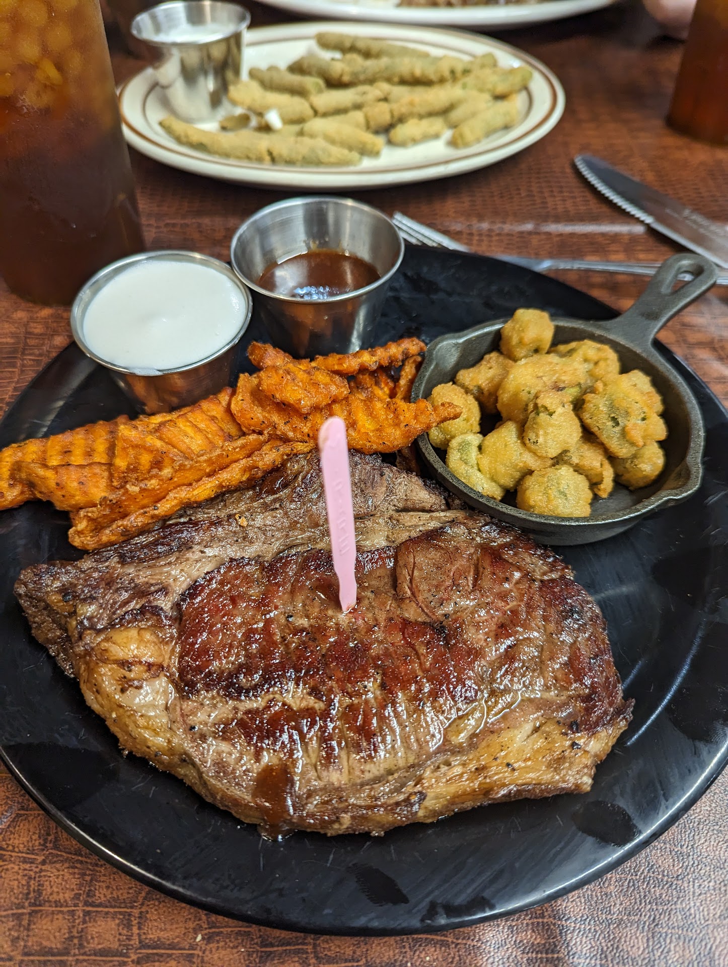 We had never eaten here, my neighbor works there I believe. I would have given the food a 5 star but couldn't. My husband ordered the Salmon and I the Grilled Shrimp, I wanted a steak but no small ribeye only Angus. The shrimp was good size but there is a main vein that wasn't removed and should have been. The shrimp was just a little tough but good, the mixed veggies were a little overcooked The salad bar was fantastic on point and the dessert bar was on point also, fresh baked cookies and the chocolate pudding yum! Oh my husband said the Salmon grilled was excellent, he should know we took a cruise to Alaska and he ate a lot of Salmon lol. Just a word about the restroom I used, it had Male/Female on both bathroom doors?? Anyway for a M/F bathroom I used it was very clean and even on floor around the toilet no drips!! Thank you and decorated very very...