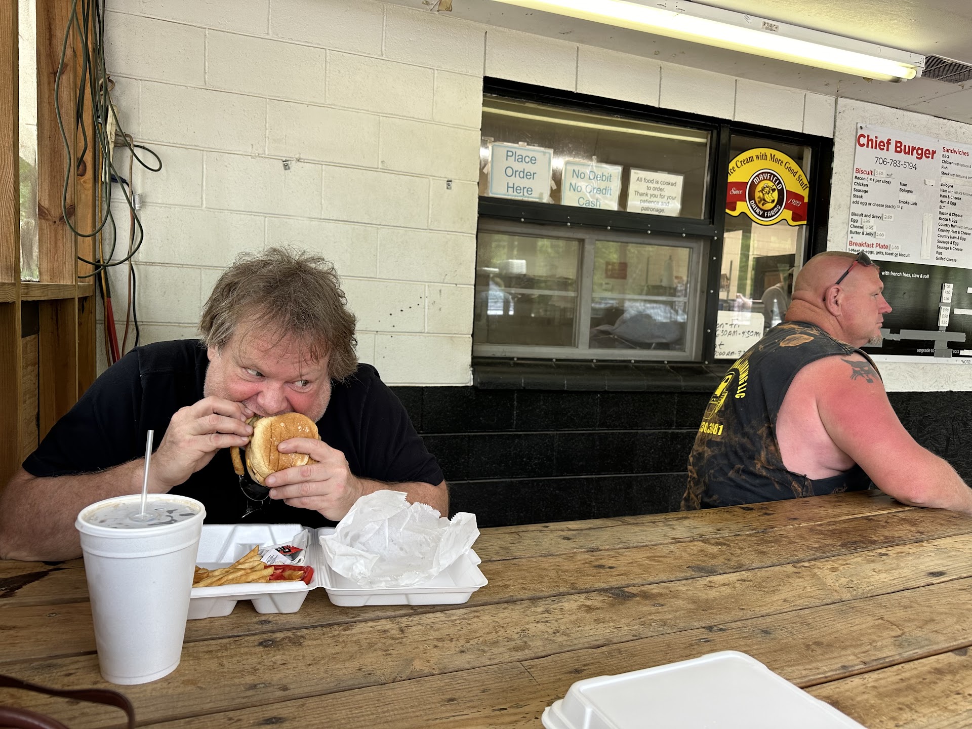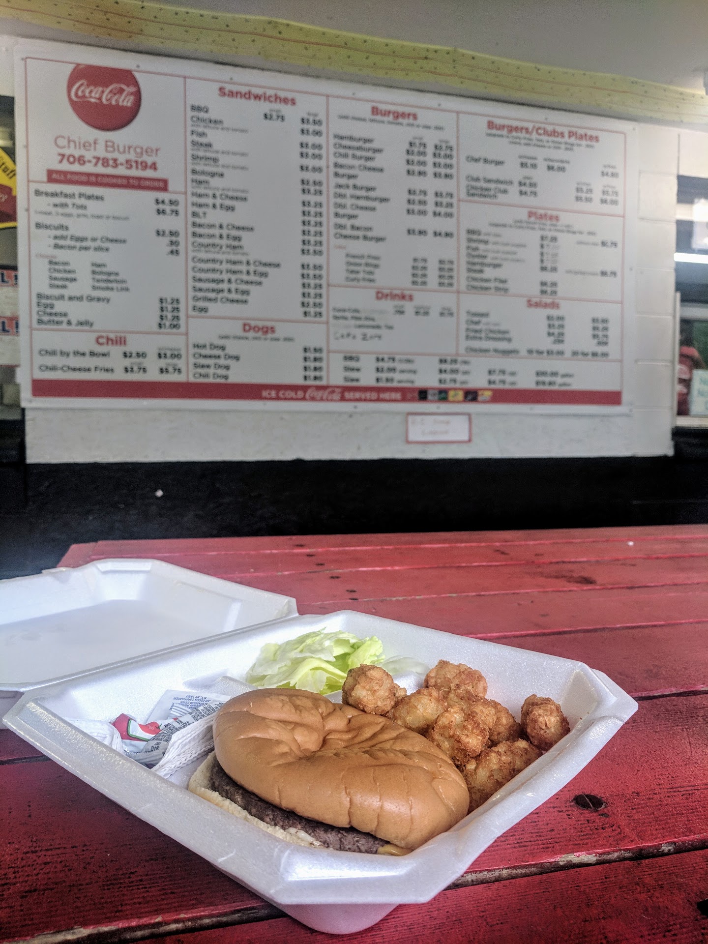 This place is from another time in the old south when you didn’t have commercialized fast food. You come in to the screend-in dining area, order your food from a little window, sit and chat or listen to the conversation of the other folks in there. It might be 30 minutes or so, get your drink ahead of time and sit and relax. This place is cool. The burger was great, so were the fries, even the Coke tasted better. We chatted and watch the people come in. Some of the people called in and were picking up, others waited, some ate there some got it to go. If you drive by and thought about it, stop thinking and just do it. They make your food to order, no heat lamps, and they are busy, so be prepared to sit a while and take it all in. These type of places are few and far between and should be a cherished. Again, this is not fast food. This is the good old south the way it used to be and I am so happy we found it again. The fellow next to me recommended the chili burger, so I’m doing that next! We spent around 20 bucks for two Chief Burger plates and two large drinks. You...
