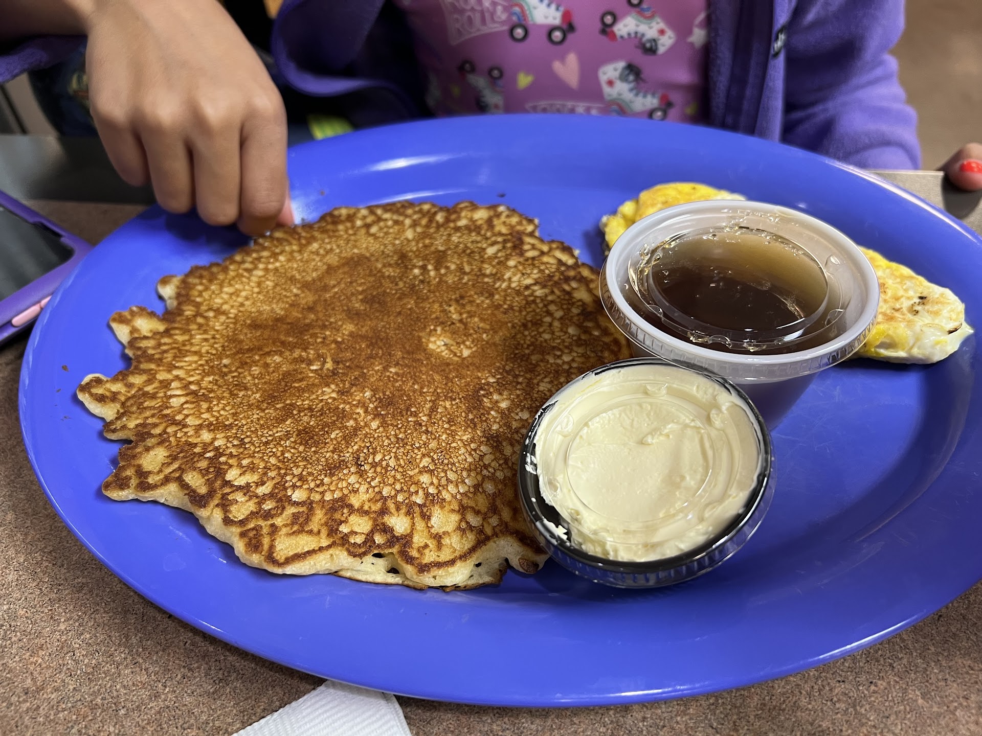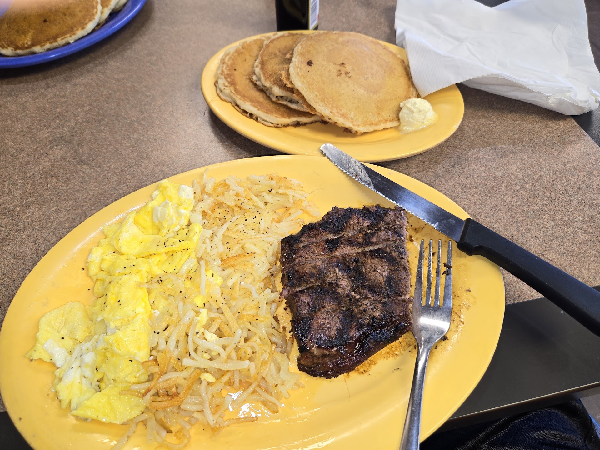 Read moreStopped here on a whim after my daughter’s aerial lesson. Typical truck stop diner; there were no signs saying to wait to be seated or to seat yourself (and no waitstaff to be seen—she was in back getting a to-go order), so we had to wait as we didn’t want to get overlooked. The waitress was friendly and the place was mostly empty when we arrived, but started getting busier shortly after we ordered. My daughter got the sweet cream pancakes and scrambled eggs, and I got the burnt ends. Her eggs seemed a bit overcooked but tasted good, and the pancake was nice and sweet (smelled almost like birthday cake). The burnt ends were tender and a decent sized portion, and the sides were pretty standard. The dry rub has a nice little kick to it. We finished off with a slice of cherry pie. It was all right, but had a strange pink tint to it that made the pie look like it had been sitting there for a while. All in all a decent meal, all for about...