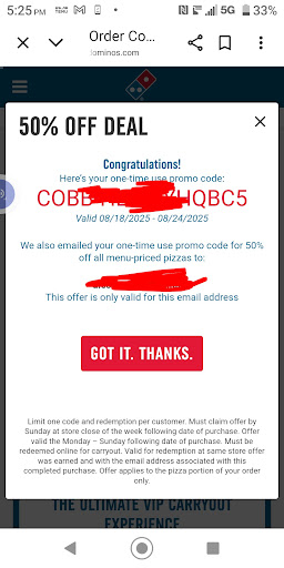 Read moreI ordered a $35+ med pizza, when I got there they asked me what I needed, I told them I had to pay for my pizza (I ordered online ) they asked who I was, I told them I was still in the que and said my name, ok, they let me pay... My pizza came out the guy back taking the pizza out boxes it up, I reminded him I had the garlic Parmesan crust. At that point I guess I asked him to go above and beyond the way he looked at me. He looked at the receipt opened the box shook a little cheese on it closed the box handed it back, wanted to charge me for the entire pizza again, told him he still shorted me the garlic butter spread, he just pushed it out to me, so I guess it's ok to over charge someone and then not give it to them even after asked to correct it. And would not honor the 50% of coupon I had on my phone either. SO, I GUESS I WON'T BE GOING BACK...