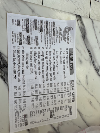 Read moreThe breakfast burritos here are great! I get the #7, all pork with half and half with cheese. Every bite had meat and fantastic flavor. I like the other places....but they just don't compete with Gomez's portion sizes and the flavor taste of the green chili. This location is small, and parking is not the best since they share space with other businesses. Unsure how a couple of comments say they didn't have any flavor? Gomez has a much better taste. Tough to eat and drive. It's juicy, and you might wear it. They haven't been here very long, so they are still working their processes out. They'll get there and become faster. I waited less than 5 min for my food each time...