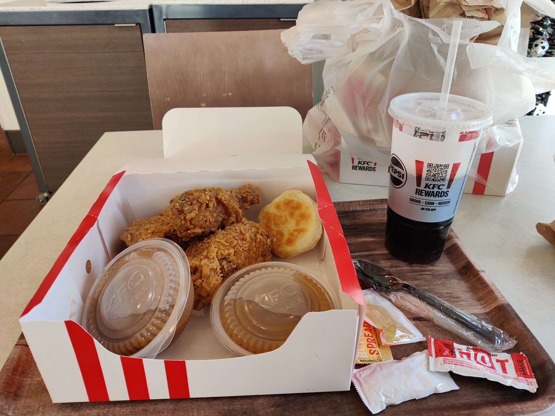 Ok, so today I placed my order. Got it crispy recipe and it was good. Tasted fresh. I got there early. That's probably why. 😂 Again the biscuits are still the same. Crumbly. Also the plasticware still has the same smell. Again for management please check all you plasticware. It does have a funky smell. Not to sure about the corn, did not taste sweet like advertised. It actually was dry, not sure its supposed to be that way. Hopefully in the near future I'll give an update. For now it stands at...