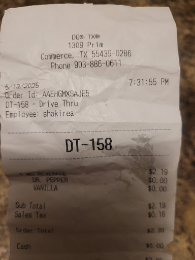 Read moreI went through the drive thru to get a medium vanilla Dr. Pepper, my total was 2.35. I handed the guy a $5 bill. He handed me a receipt and 65 cents. I didn't notice this until I had got across town at a car wash. I called, and it rang several times before I hung up and decided to go back up there after I washed my car. I went through the drive thru and explained what happened. I got to the window and 4 people blankly looked at me and I had to say I'm the one who got short changed. I had the receipt and told them I just needed the $2. They almost acted like I was trying to rip Dairy Queen off for 2 bucks. They got the manager and she apologized and I told her I was sorry I didn't mean to get anyone in trouble and she walked away but another employee walked up to the window to tell me next time I needed to come back faster and I explained I went across town and washed my car and came back and I guess she missed me saying earlier that I called and no one answered. I thought that was extremely rude. How bout give me all my change...