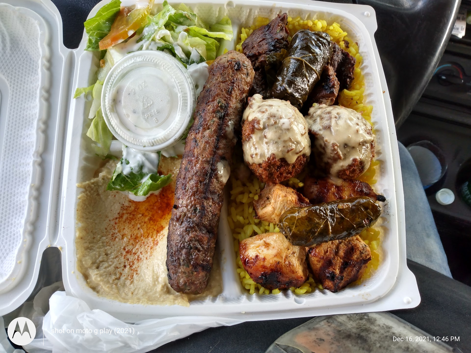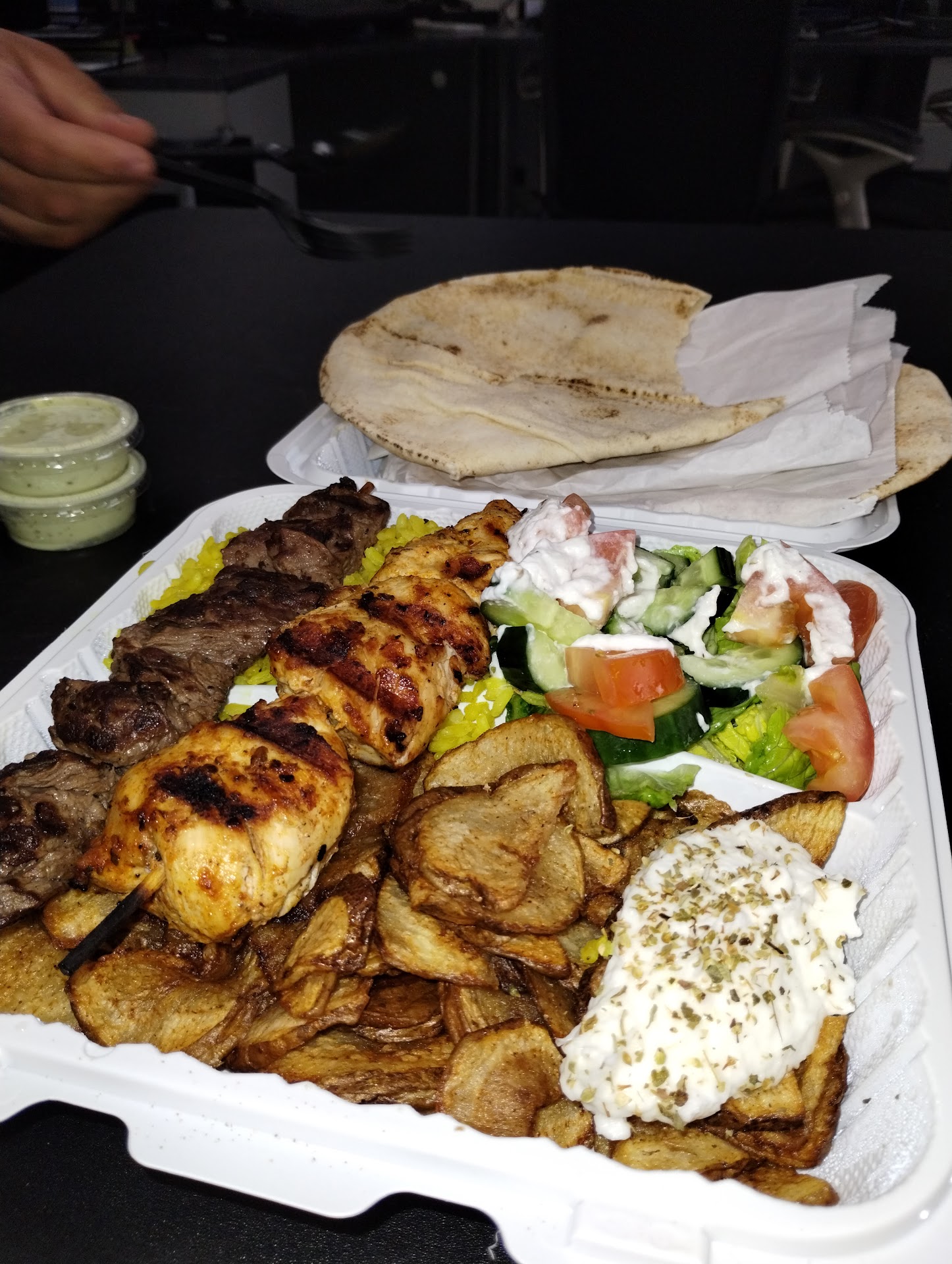 Read moreI love this place. One of my favorite places to get lunch during work days. It's inside the Food Plaza with many other food choices but you can't go wrong with Mediterranean food. My favorite dish is the chicken kabob platter. It comes with 2 chicken kabos, salad with yogurt dressing, pilaf rice, and hummus. The green sauce is spicy and just right to add that extra kick. It's very convenient that you can place phone orders to beat the lunch rush. However, I went on Friday, 7/13/18 and ordered in person and order was made just in time. It was packed but they were getting orders out on time. I could eat here every week :)....