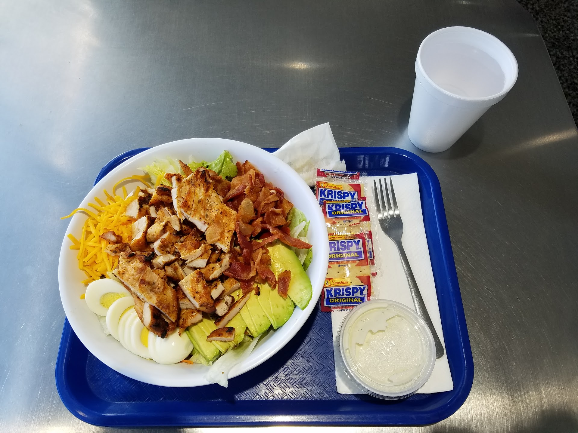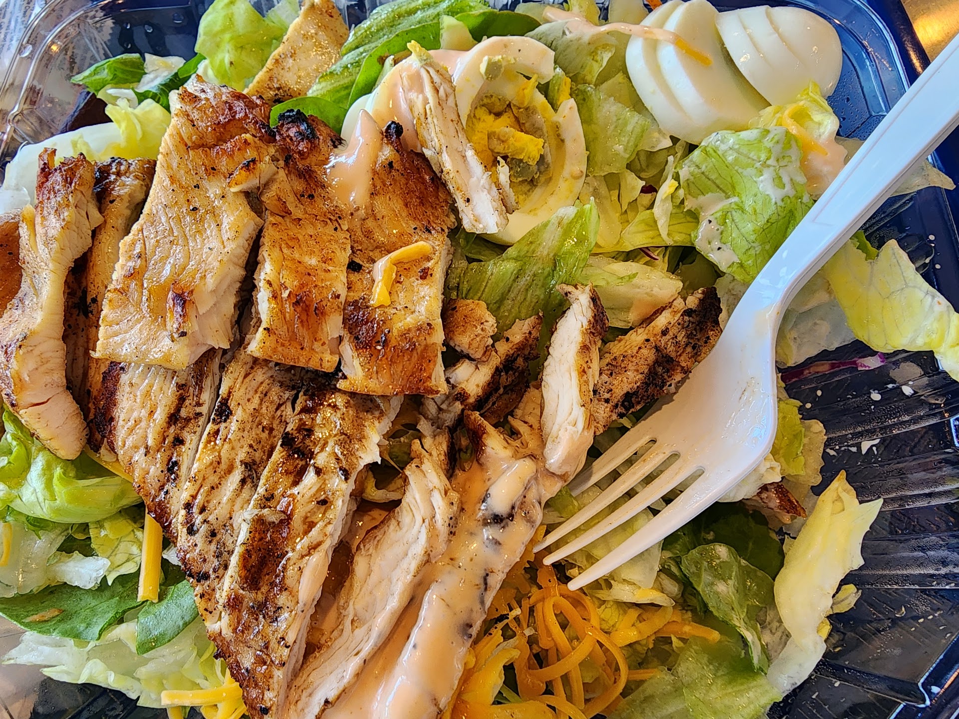 I wanted something quick, so I ordered a chicken caesar salad. The salad was huge and filling. It comes with chicken, iceberg lettuce, croutons, parmesan cheese, caesar dressing, and little bits of purple onion. The salad was good, and the iceberg lettuce was fresh and not withered. Overall, it’s a good place to get...