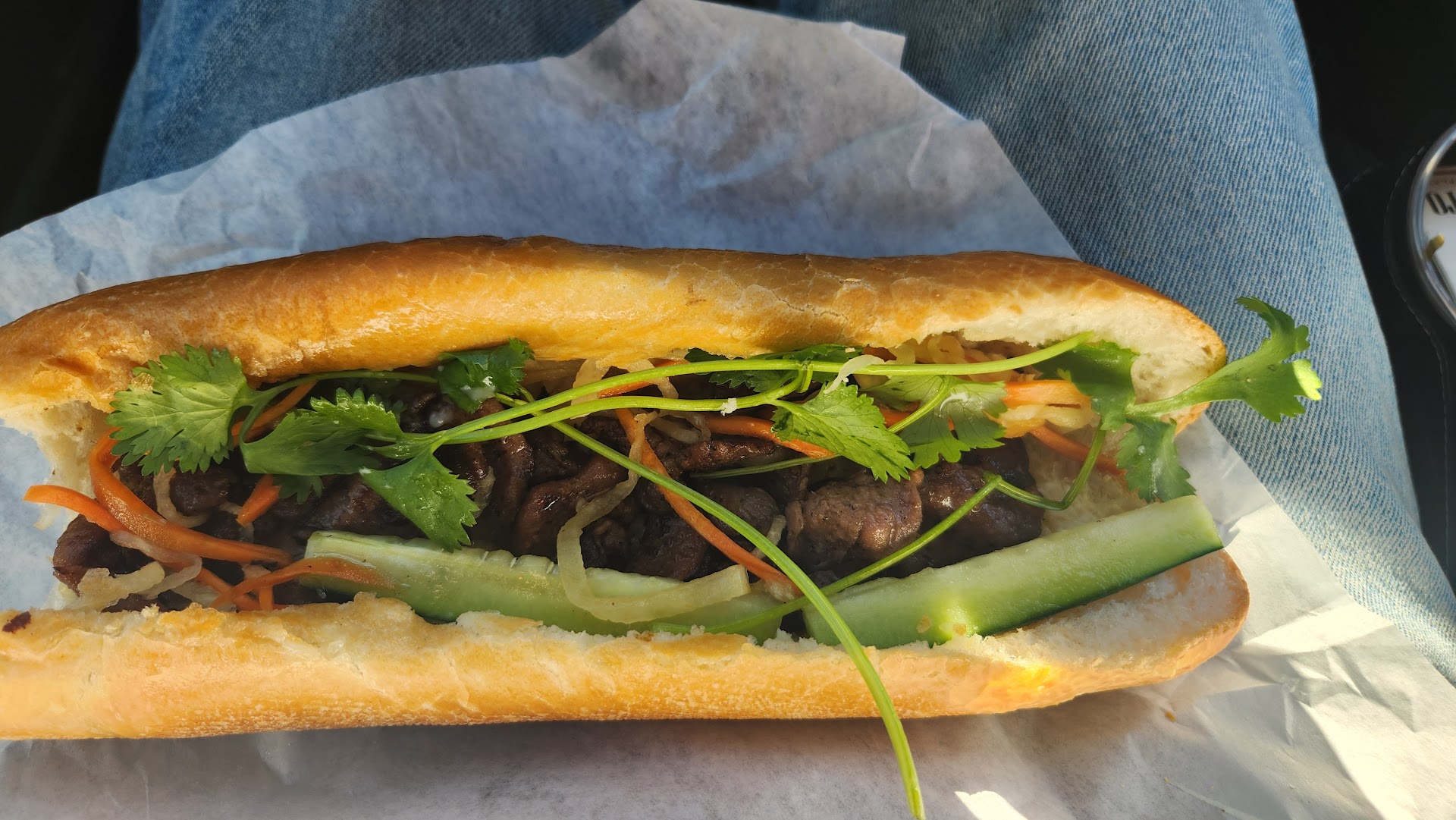 Price was around $10 with tax. Most expensive banh mi I've ever bought. Bread was warm but not toasty. Seriously skimped on the veggies. See image. The banh mi had a slight sweet taste to the spread that wasn't overwhelming. Pork was seasoned well and tasted good.