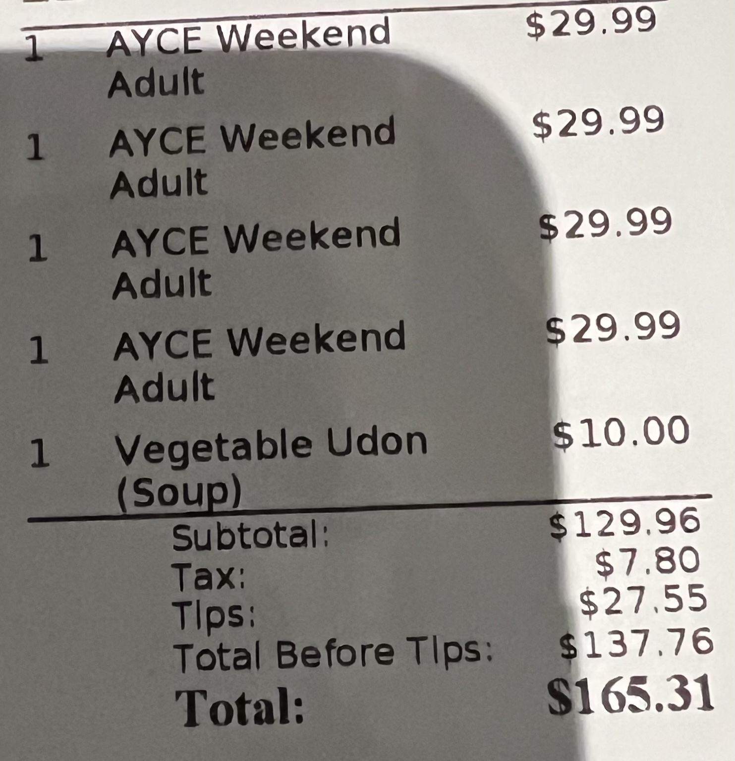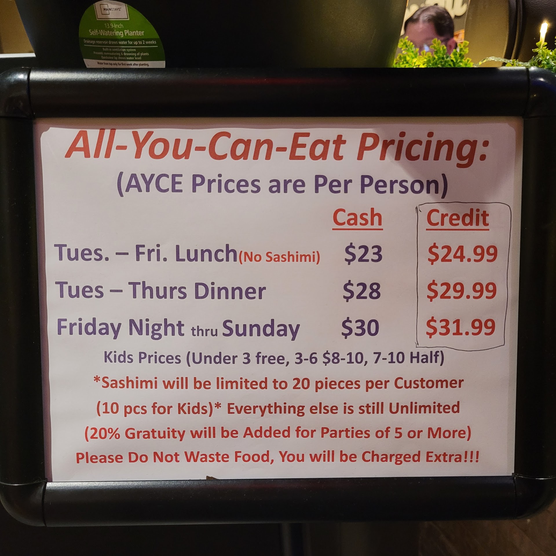 This place has nearly a 5 star review and we been seeing advertisements in our local Facebook community group so we decided to give it a try. Unfortunately, we were not a fan or maybe this was just not for us. Our experience was on the AYCE sushi. We been to other AYCE in the area and in the greater Philadelphia region, the sushi/ sashimi here were average. We went on a Saturday night for dinner so the price was $29.99 per person. Food came out pretty quickly. There were about 4-5 seated tables including us. We were the largest group with a table of 5 (4 adults and 1 kid). Service was alright but when it was time for the bill things felt a little weird. When we asked for the bill, the server gave us our check for 4 AYCE + 1 regular menu item $10 for my 4 year old son + $12 drinks, the subtotal including 6% tax was about $150. They had an offer to pay cash and all drinks (non alcoholic beverages like soda, tea and sparkling water) will be waived so we decided to pay in cash. We told the server we would like to pay in cash. She asked that we give her the cash first and then she would go adjust the bill. Maybe this is a new way of doing business or confusion on our end, but we asked if she could adjust the bill first so we can pay everything at once including tips. Eventually she went to adjust the bill first. However, came back with an adjusted bill and a 20% gratuity added on the total (sub + tax). The reason is because we were a party of 5 or larger. This was a surprise as we did not know this was their policy. The new total is $165 with tax and tips. No big deal as that’s probably what we were going to pay in total anyway. When we were walking out, I saw a sign at the entrance stating there is a 20% gratuity added on parties of 5 or more so womp womp faults on us for not seeing that beforehand but I’m just confused why the initial bill didn’t reflect the 20% gratuity? Why did they waited until after the drinks were taken off to add it?