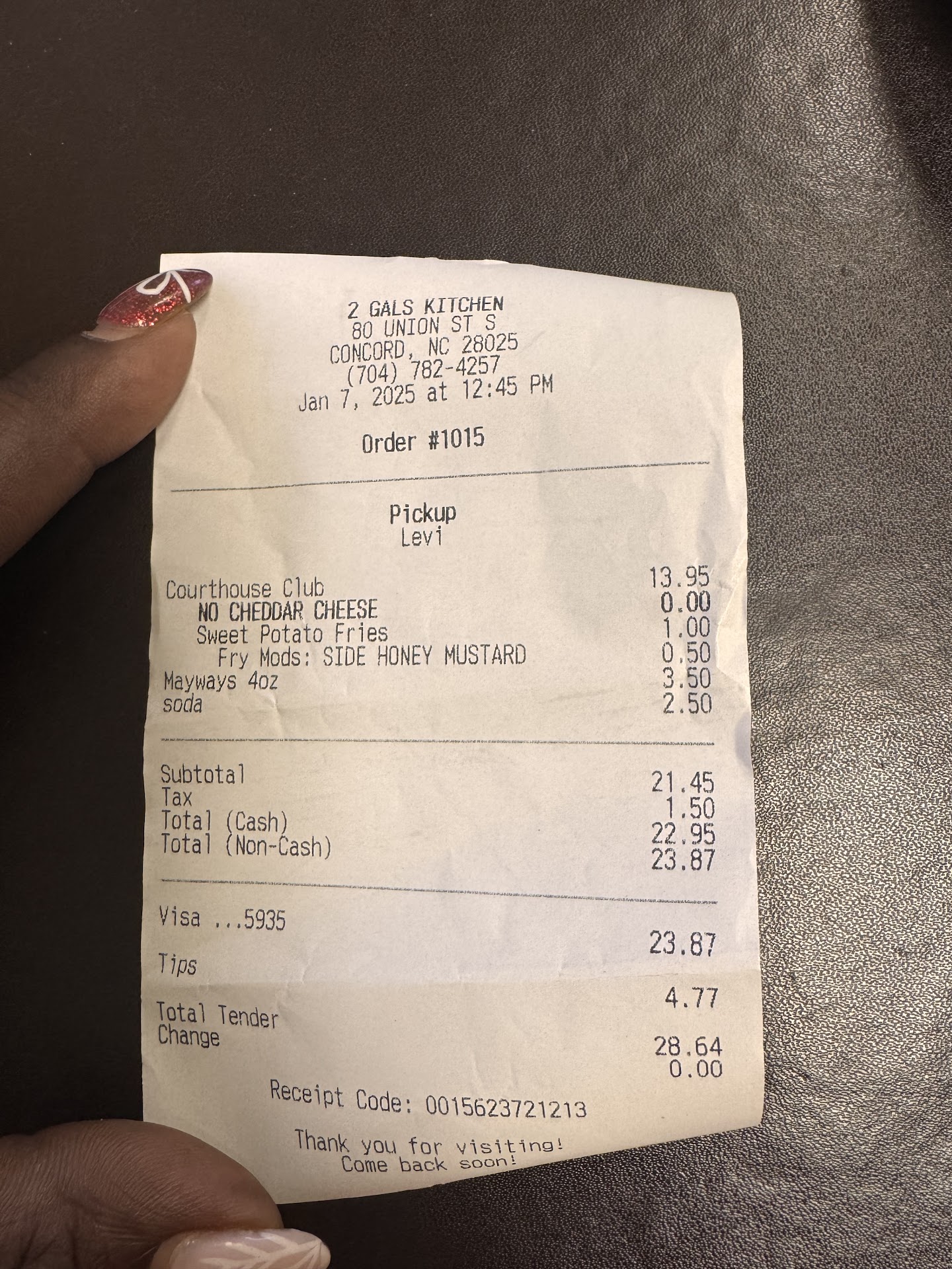 Read moreI typically visit the area where this restaurant is located for work purposes. They are normally closed when I am in the area, so I was excited to find that them open and hurried to place an order. I ordered the courthouse club no cheese with a side of the sweet potato fries and a side of the Mary ways pasta. The food was trash. The waffle fries were cold immediately upon opening the box inside the restaurant. Again inside the establishment, The waffle fries were cold. I waited about two minutes on a cup of mustard and pickles. Once I got to my office and inspected the sandwich, which is described as a toasted on Italian bread with thick cut, bacon, seasoned tomatoes, Crisp Romain Lettuce, red onions, and Tangy mayo. However what I received was a sandwich on plain white bread (the end of plain white bread at that). Chunks of what I assume to be turkey breast, no bacon a few pieces of lettuce, some onions and two tomatoes. Again the waffle fries were cold. I called the establishment and spoke with the young man who took my order and explained what was going on and he advised me that I could bring the sandwich back for a replacement. When I returned to the establishment, a lady was waiting on me. She wanted to inspect the sandwich. She l went and got a glove to test if the bread was toasted and stated that the bread had a light toast. What she did not know is I am a culinary student, I know what toasted bread looks, feels, and most importantly TASTE like. I took a bite of the sandwich and the bread was cold. I asked for a replacement and the lady said she could add bacon to my sandwich after touching it.. Even though she had a glove I was appalled that she would offer me the same sandwich after she inspected it. I wanted a refund and could tell that was not an option for her. As a future Culinary Professional I understand that operating a restaurant is costly. So hopefully the 23.00 plus 5.00 will help improve...