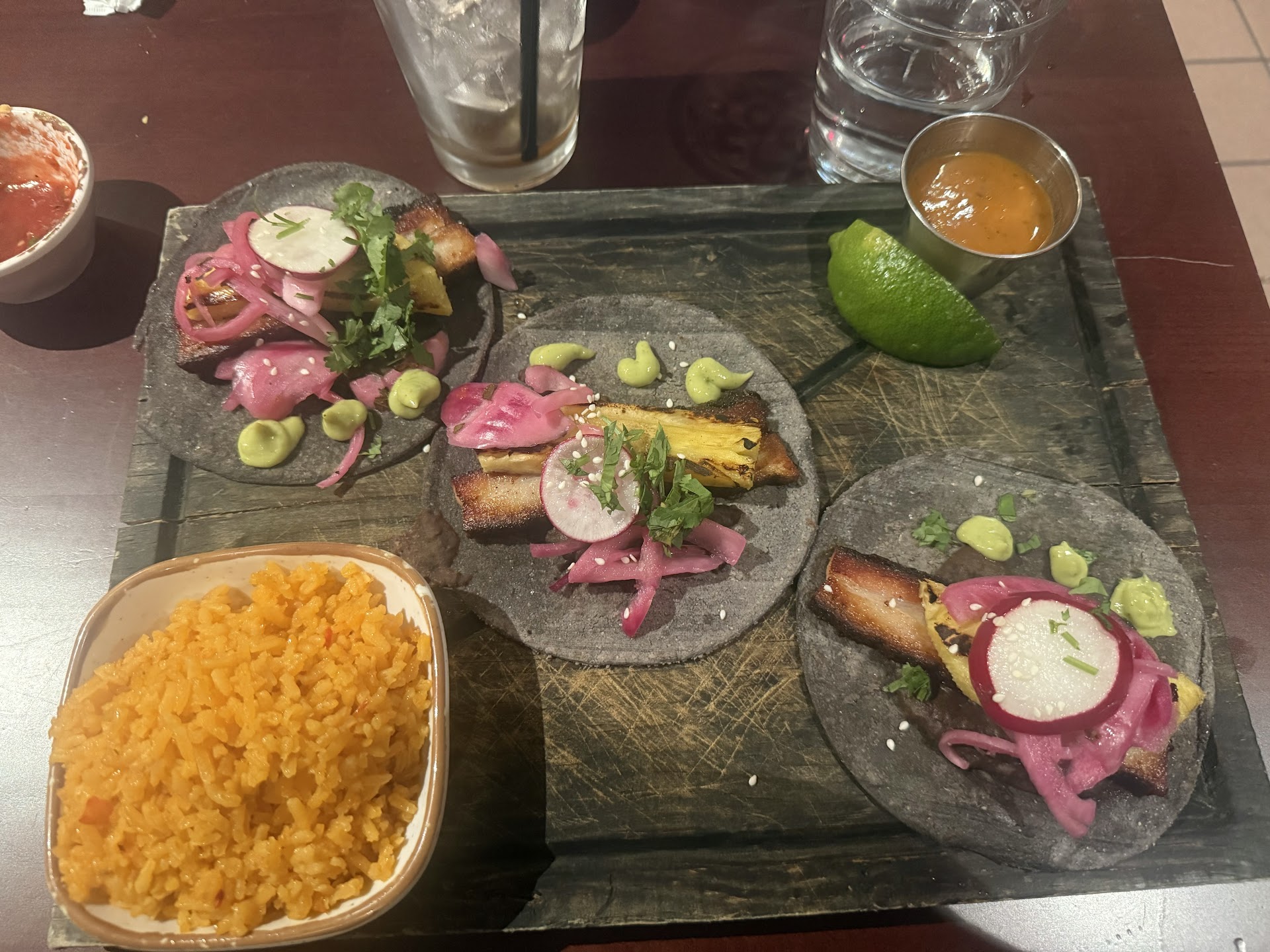 Definitely a place me and my family won't come back to. I ordered the pork belly tacos. They were small 2-bite tacos. Tortillas were dry and bland. Pork belly was decent. Rest of the flavors suggested in the menu description were severely lacking. Youngest daughter got pollo tacos. Menu description said tomato queso fresco and avocado. We asked for no avocado and queso fresco. Asked to add lettuce and shredded cheese. Server said cheese already came with it on the bottom of the taco. Tacos came out with no tomato, no shredded cheese or cheese on bottom, and lettuce was a salad mix with radish cabbage and carrots that we had to pick out. Daughter didn't like the tortillas for the same reason i didn't and said chicken was flavorless and dry. $18 for the chicken tacos and $20 for the pork belly tacos and it probably should've been no more than half that. The kids menu had chicken tenders and fries a cheese quesadilla, Mac and cheese and chicken and rice. Not very good for a kids menu esp at a Mexican restaurant. Oldest daughter ordered a carnitas burrito with only rice beans and guac. Burrito came with Curtido, crema, and red sauce and no meat. She had to send it back and it came back the way she ordered it and said it was decent. My wife got the beef chimichanga but it wasn't fried and came out the same way as the burrito. She didn't mind it and i had a few bites and it was decent. My youngest daughter's pink lemonade had black stuff floating in it and we needed a new one. The warm chips and fresh salsa and the churros were both excellent and worth getting. Our server Jose A. Was very good and attentive and was quick to correct the many mistakes the kitchen made. The atmosphere was nice: clean and presentable with cool murals and decor. Unfortunately the portion size and quality of the food didn't match with that. There was also another male server way that was not our server that kept approaching our table and asking me about my weight. I found that to be incredibly rude and disrespectful especially being done in a public place. We absolutely will not come back to this...