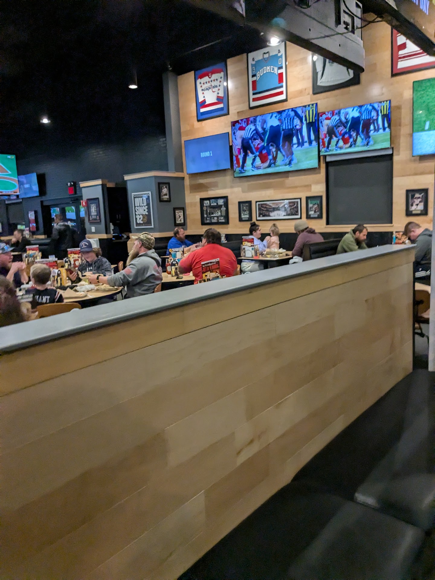 My son loves their salt & vinegar wings & wanted to go for his birthday, it was the 1st time for the rest of us (7). They put us on the heated patio, which would've been great because it was much quieter than the main room (which was packed- good sign) & we had some older guests, except we kept getting hit by the cold air as people went in & out an exit door, so we had to keep sweatshirts/ jackets on. An easy correction would be the metal chairs sliding across concrete floor, it can be very loud, like nails on a chalkboard, but I'm sure there are rubber or felt parts they could put on the bottom to help. I heard the nachos, onion rings, mozzarella sticks, fish sandwich, potato wedges, & burgers were good. Buffalo Mac & cheese is pretty good, love the flavor, but I'm picky about grissel in my chicken. I heard the wings were awesome. There was some disorganization from the staff that could be smoothed out and the "hostess" could use some training on greeting & hospitality. Our waitress (Carissa?) was awesome- very friendly, helpful, kept checking in, & fast. Just a tiny piece of advice, if someone is hoping for a hot drink during winter months & there is coffee available, but not brewed yet, please brew some, it'll go a long way. After the "hostess" brushed me off, a gentleman (not sure if he was the manager?) was kind enough to help me take care of the bill & he helped us end the evening on a good note, which was much appreciated. More than 1/2 will never go back; I liked the potential & fun atmosphere, if they improve some of their staff & some of the other suggestions, I would go back & I would feel better about to recommending it to others. If you're just looking for somewherr to meet friends for drinks, app, & watch a game, then this is the...