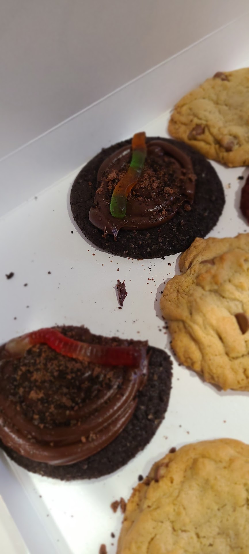 Ā Ā Ā Read moreLong wait just for cookies, but we wanted to see what the hype was all about! The smell of sugar permeated through our masks when we finally got in the door. Quick ordering when you know what you want. I mean, if you're waiting 20/30 minutes in line, you would think everyone would already know what they want by the time they approach the counter, right? Wrong. That's what holds up the line! LOL. The cookies smelled great, the kitchen was super busy! Cleanliness was a bit lacking if you ask me, refrigerator handles stayed dirty, kitchen staff all over the place with flour, eggs, oil, the boxes that the customers receive their cookies in are riddled with icing...messy, but the constant demand must make it tough to keep up? We ordered the 12 pack party box because why not? Cookies were very inconsistent as far as size, decorations/icing and amount of chocolate chips. A little disappointing to get a big chocolate chip cookie and your first few bites have ZERO chips. Errrggg. If it didn't taste like yummy butter cookies on it's own, I would have called to complain. My 2 dirt cake cookies were very dissimilar too, it was very evident that someone was cutting corners with the icing...wish I noticed before I left the store. Will I go back? Possibly...just to try some of the new flavors (that's the attraction I guess...always in search for the new stuff?) It's just sad to see that the fast paced work in the store makes employees serve inferior products for the prices you pay and the time you spend in line. Make sure you check the quality of your cookies...