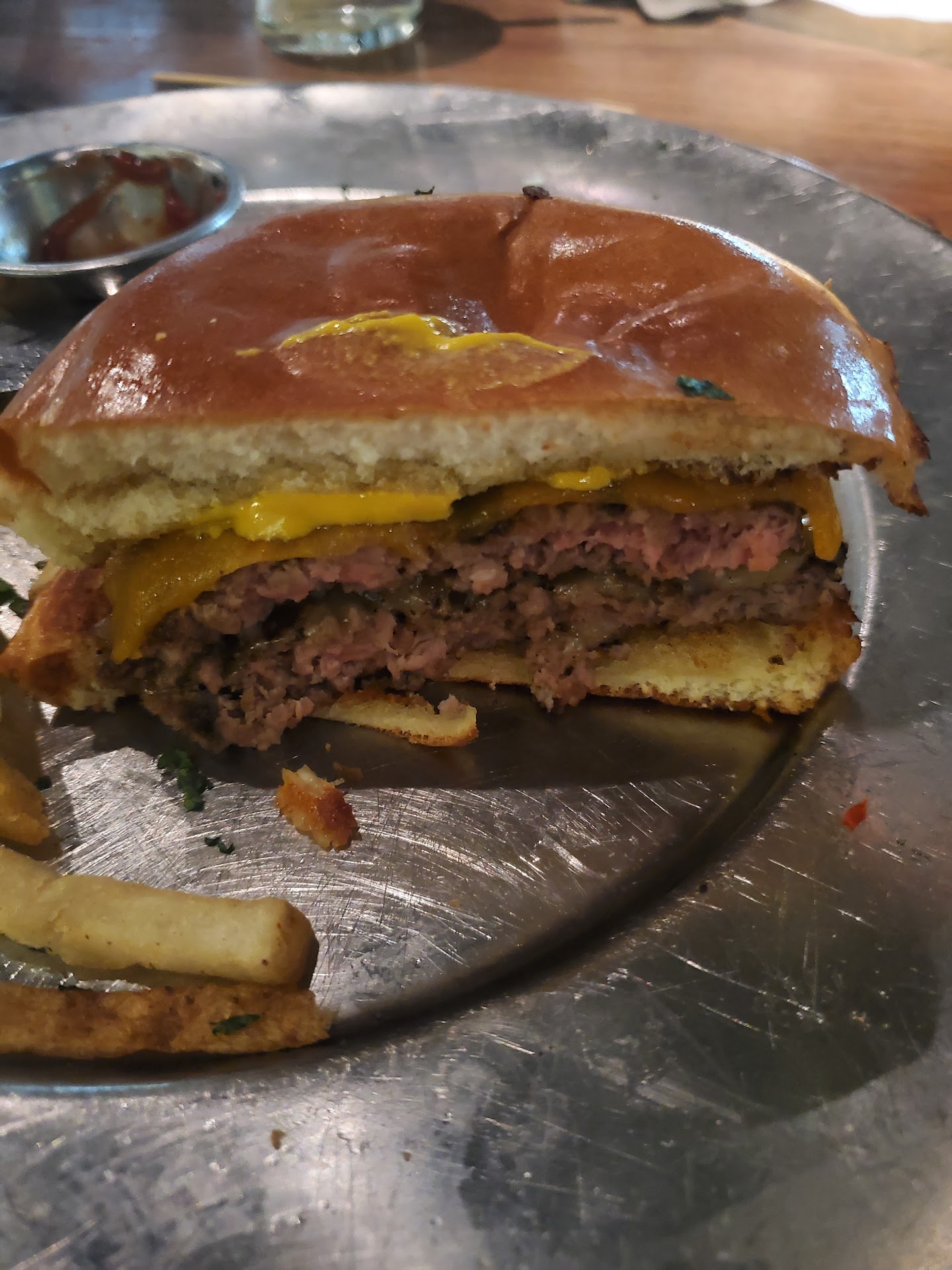 Lollipop corn dogs came out next. 5 large corn dog "bites" on sticks. Totally adorable - majorly delicious!! A light corn shell over extremely juicy meat filling. The best part about these wasn't the amazing hot dog or the corn shell: it was the mustard they were served with. Their house-made spicy porter mustard was so good I ended up dipping the nacho chips in it too. And then my fingers. I also asked if they sell it (they do not) but I would totally buy some if they did.