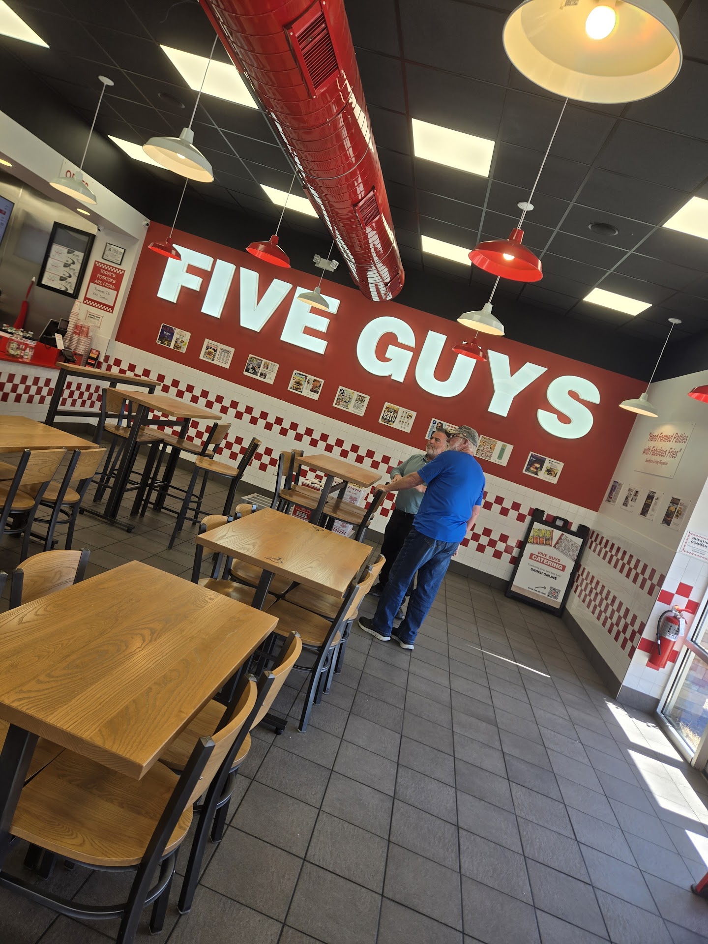 Read moreBeing from California and knowing Five Guys' reputation, I thought I'd give them a try. I'm pretty disappointed. I ordered the cheeseburger w/ extra onion, pickles, mustard, jalapeños and tomato, and a small fry crispy. The burger was a sloppy mess, which made me have to put it on a plate and eat it like a salad, then the "crisp" fries were just burnt. They were almost a dark Carmel brown and still soft. I know enough about a fryer as I have worked in the kitchen of a restaurant before. The way the fries came out only means that the oil temperature is too high. Needless to say that not being able to eat the over salted burnt fries and paying over 16.00 at a burger, which is not fine dining, is a definite no for me in the future. ...