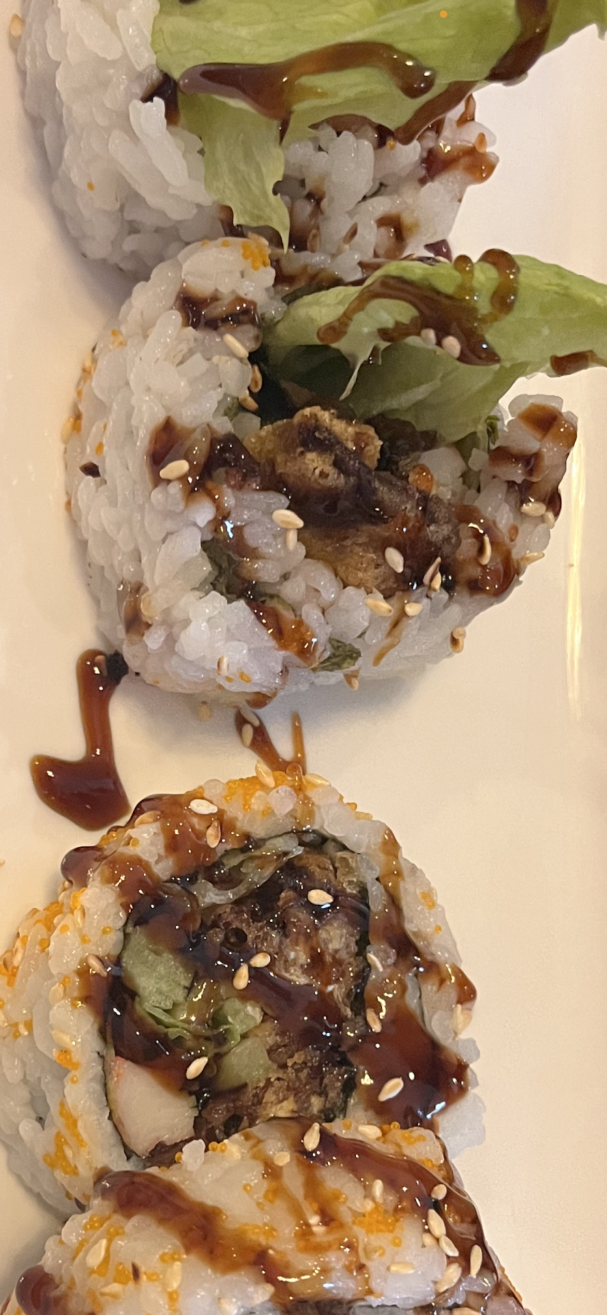 Spider Roll Sushi: The spider roll was quite disappointing. The tempura shrimp was burnt, giving the entire roll not good charred flavor. Additionally, the lettuce in the roll it made it less enjoyable.