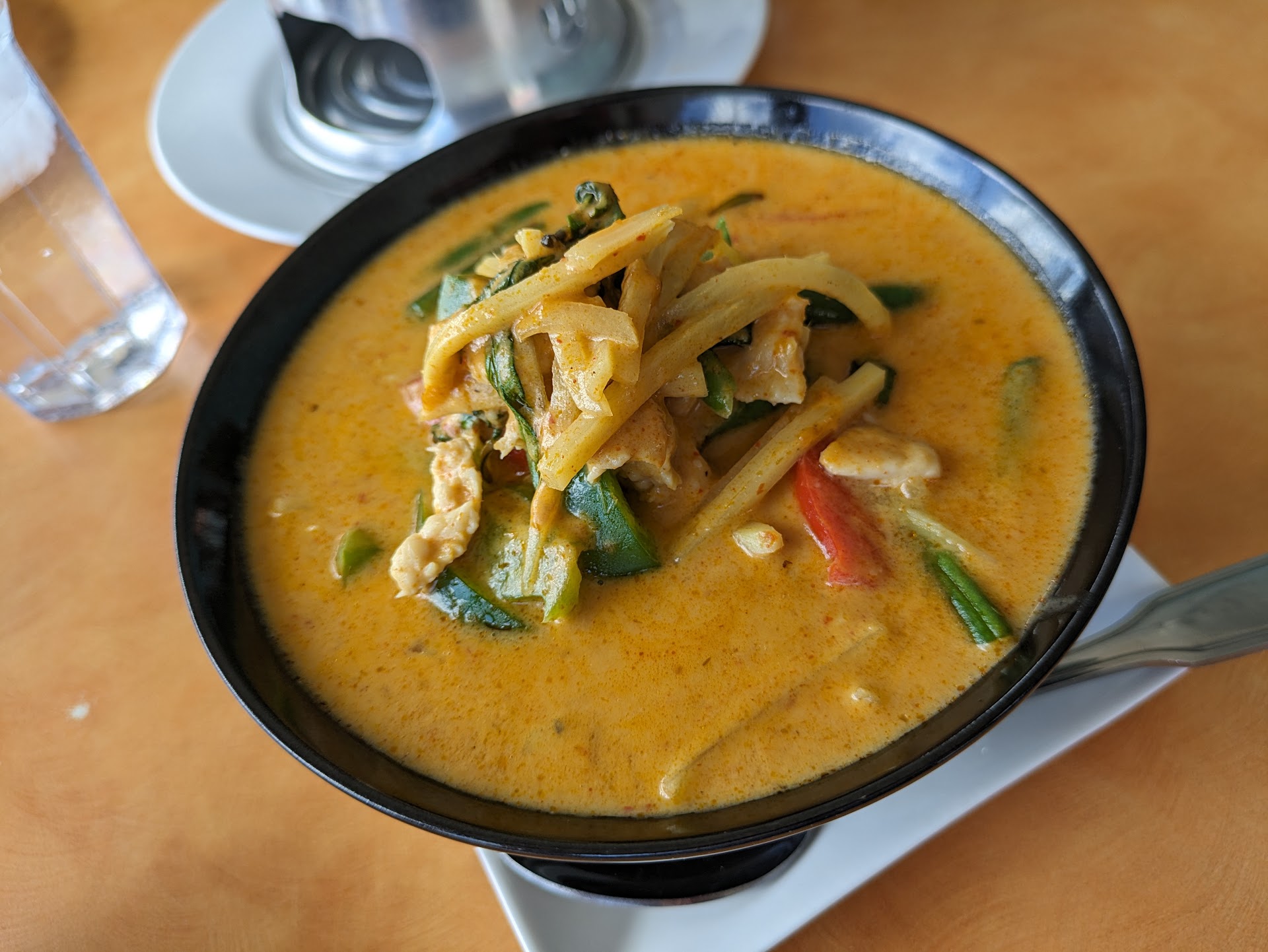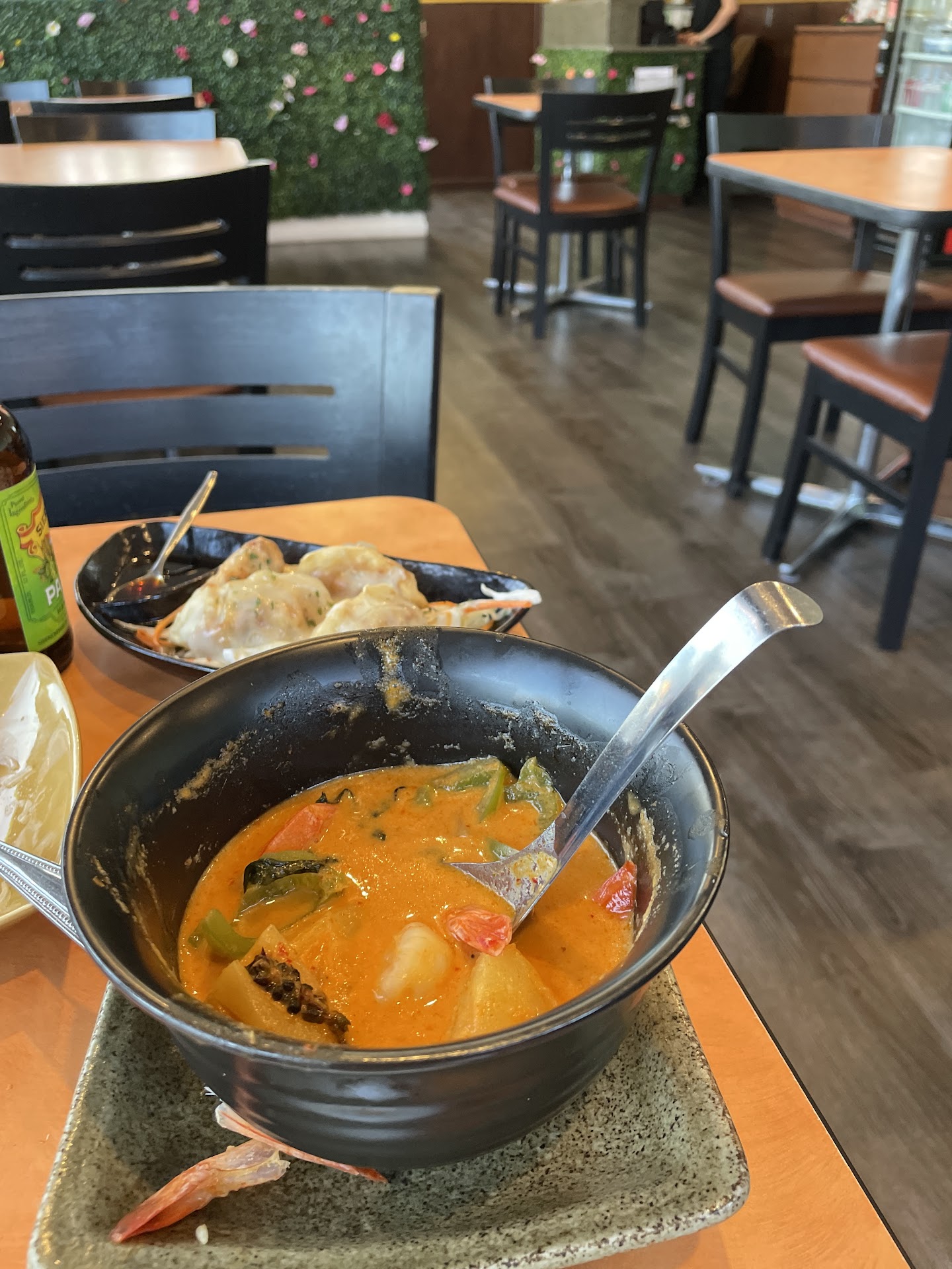 Read moreTried to love it, but I don’t. It’s not terrible, just not as good as it could be Ordered 1 app, cheesy potstickers, as it was a safe bet I figured; I was wrong. Some things are not better with cheese. But they explained that their calamari appetizer was tubes and tents, not steaks like they show. Ok. It is what it is. Really Really wanted to try the soup, but they refused to sell a small bowl/portion. Okay, moving on… Not a single item on the menu comes with peanut sauce, so if you want it, it’s extra. I bought extra ordered Pad Wokn Sen as it has glass noodles. Ordered with Pork. No flavor, at all. I mean really extremely little flavor. So added the peanut sauce. Only ok, somehow. Pineapple curry is a red curry, and consistency of running water, but it tastes ok. Not great. I wanted it to be great. I ordered a small garlic rice serving, which has roasted garlic flavor and it good. I just spoke to the owner, he came out to check tables and I let him know. I will be back to try a few...