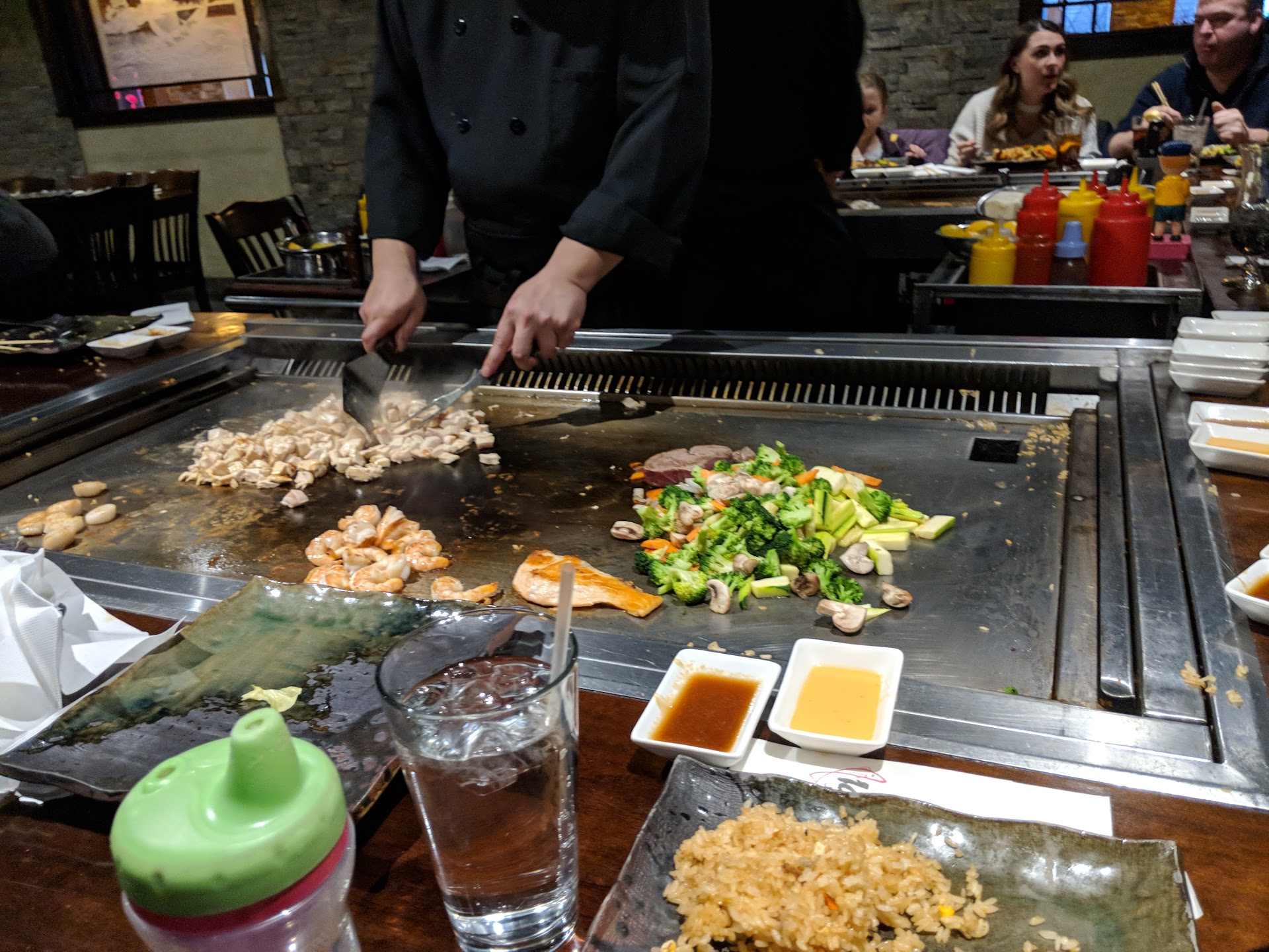 Read moreThis place is such a fun time. Take your family if you have one, or someone else's family if you don't. Great idea for date night too. If you can't get a date, I guess you could go alone, but then it's just you at a table and they'll seat you with a bunch of strangers, but you could get lucky and get a fun crowd who adopts you as one of their own. Not literally because adoption is a long, drawn out, expensive legal process. These crazy people will be throwing food all over the place and it's salty as all hell. The food is just kind of good. You're there for the show. It's like a demolition derby. They're junk cars to begin with. You're there to see them get junkier. Hate zucchini? Me too, but not when someone is sinking Kobe 3-pointers with the things directly into my gaping mouth. In hindsight, I don't even know that the undercooked vegetable was zucchini. I didn't care at the time. I was just praying that he didn't fling someone else's shrimp my way because I'm deathly allergic. Well, I assume I am. They look like gross like pinky toe insects and I don't know how anybody stomachs that sort of thing. If those things were crawling around on land you wouldn't think of eating them, but because they're in the ocean you do? That makes no sense. I go with the filet mignon, but it's pronounced "min-yawn" just so you don't look as foolish as me ordering it. It's everything...