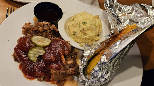 The food was decent but somewhat underwhelming. I really enjoyed their habenero BBQ sauce. It was a little sweet with a pretty good kick. I ordered the pulled pork dinner and my only complaint was that the pork was really fatty. I get that pork generally has a fair amount of fat, but almost half my portion was fat - which I could not, and did not eat. So while the meat itself (what was there) was delicious, I felt like they could have done a better job and weeding out some of the fat. Also, the corn was interesting. There was some kind of milky cream on it. I didn't love it. It was just...ok. The potato salad was really good, however.