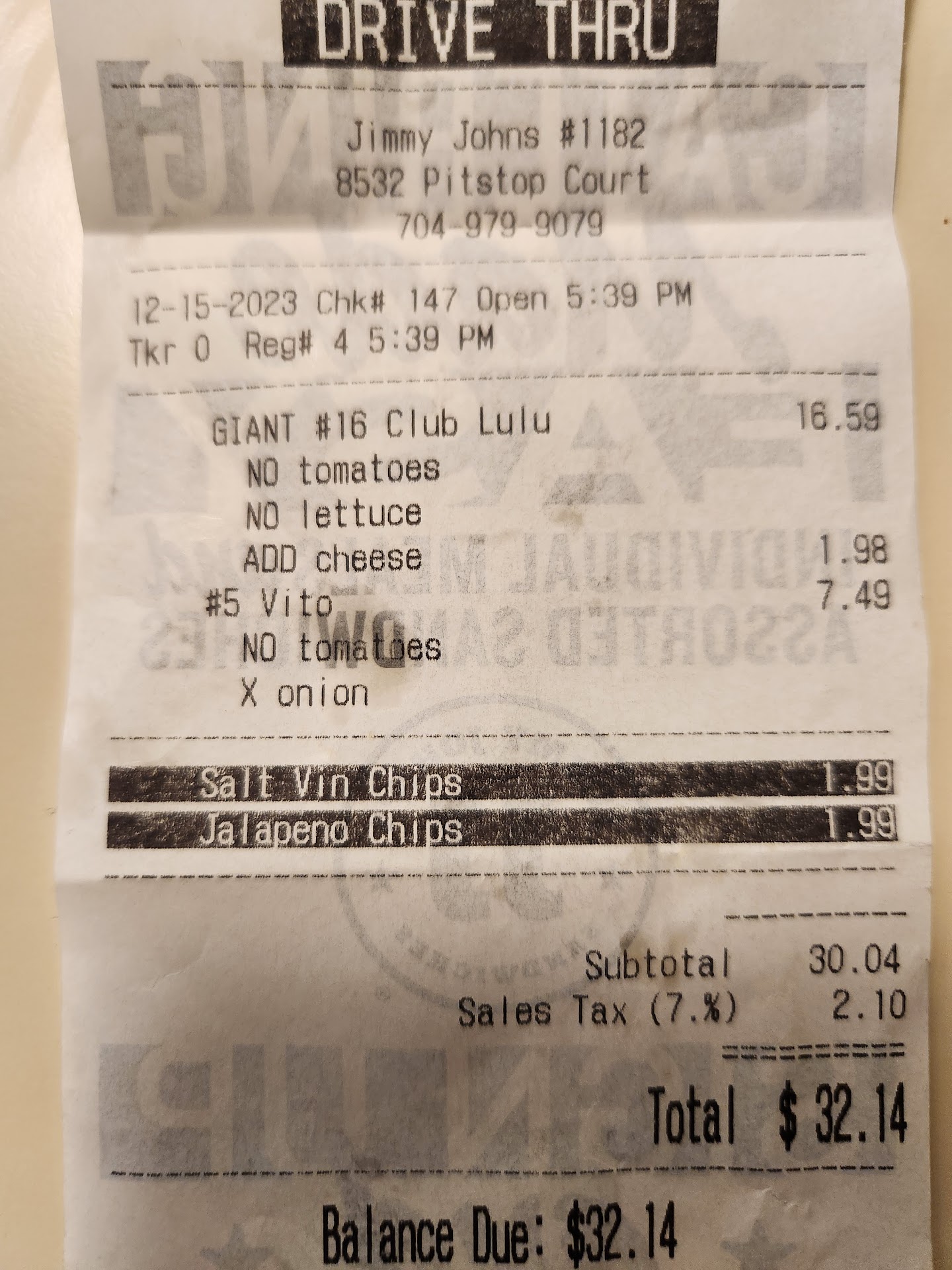 Read morePlaced an order for delivery at 1210 pm. At 1252 called the store, the gentleman that answered the phone stated that "a third party was called to deliver and it was picked up at 1232 pm". I stated I had not received it yet and would wait another 30 minutes and if " I haven't received it by that time I would call back and someone was making me a sandwich". So 30 minutes later at 122 pm I called back and stated I was at that point going to pick up my food, but you need to do something about the delivery fee. To the credit of the Staff they didn't charge for the food. I realize that not all "3rd party delivery people " are shady, however the reason I ordered from your establishment is cause your supposed to be " freaky fast" I assumed (wrongfully) that jimmy johns delivered thier own product as they have before. I have never had a good experience when a fast food delivery chain used a third party delivery...