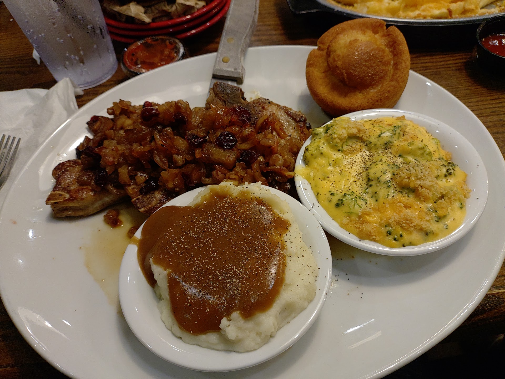 Absolutely delicious food! For an appetizer we ordered the Barbecue Chicken House Chips (my new guilty pleasure!). The potato chips were delicious by itself and the chicken, barbecue sauce and cheese took it to the next level of yumminess. My husband ordered The Famous Buttermilk Fried Half Chicken (no sauce), mac and cheese, fried okra, and a corn muffin, with Sweet tea to drink. The chicken was crispy, you could hear the 'crunch' when he bit into it. He enjoyed the okra, said it wasn't slimy (I'm not a fan of okra and I wouldn't try it). I got the Classic Beef Liver and Onions, collard greens, mac and cheese, and a corn muffin, with Blackberry iced tea (so freakin good!!!!) to drink. I got two pieces of liver under a generous mound of onions. The liver was tender and tasty, it didn't taste like iron at all. It's one of the best tasting liver I've had at a restaurant. (My husband doesn't like liver but he tried it, and said he could eat it if he was starving- that's a win for this liver!) The onions could have been grilled a little bit more but were seasoned well. The mac and cheese was gooey and had a crust on top, but it was average tasting- it wasn't a boxed mac and cheese, not the worst tasting, but not the best mac and cheese I've had. However the collard greens were fantastic! They were perfectly tender with great flavor. No vinegar taste, like other restaurant's collard greens, but had the perfect blend of spices that actually complemented the collard greens and let the collards flavor shine through. I enjoyed dipping the corn muffin into the juice of the collard greens. The corn muffin was sweet and soft and delicious! I could taste the honey in the corn muffin. Perfect texture throughout the corn muffin. I ordered a strawberry punch cake to-go (too full to eat it at the restaurant). When I opened the container at home, I could smell the strawberry, just like strawberry punch (oh so yummy!). The cake was moist and fresh, and reminded me of raspberry zingers.