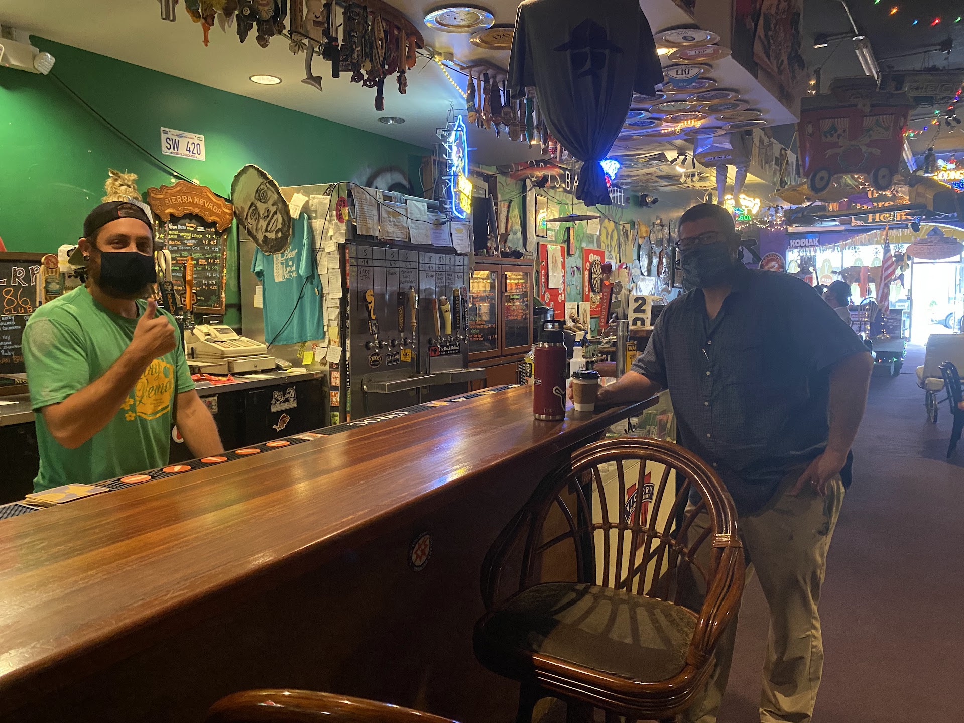 Want something to do or somewhere to go on a Friday night that has friendly bar service, chatty regulars, local guest bands, and decent snack-like foods...then walk on in. The eclectic atmosphere and decor of donated couches, car seats and pews for sitting; art hanging on the walls done by locals (some for sale, too) for viewing; and countless metal signs advertising breweries and libations to street signs and the like are mounted on the walls and ceiling for reading, along with novelties such as an airplane, a kayak, a paddleboard and a stuffed moose that hang from the ceiling. The menu boasts of hot dogs, sandwiches and nachos with a few other finger foods to partake in while listening to the live band playing...