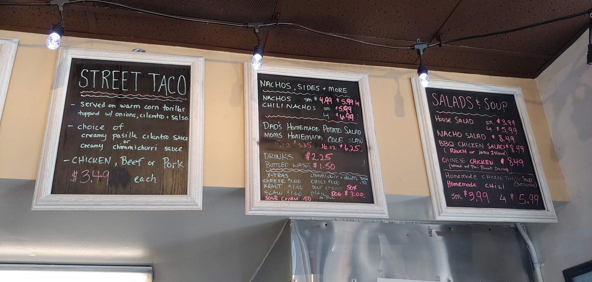 I love this place! I always get... their chili dog with cheese and tomatoes, Along with their awesome potato salad. It is some of the best potato salad you will ever have and it keeps me coming back time and time again! The ladies here are always so super friendly amd eager to help. Prices are a little on the high side.....but not too bad. I think for what you get it's worth it. I would definitely say to come try this place... And eventually I need to try one of their burritos cuz they look...