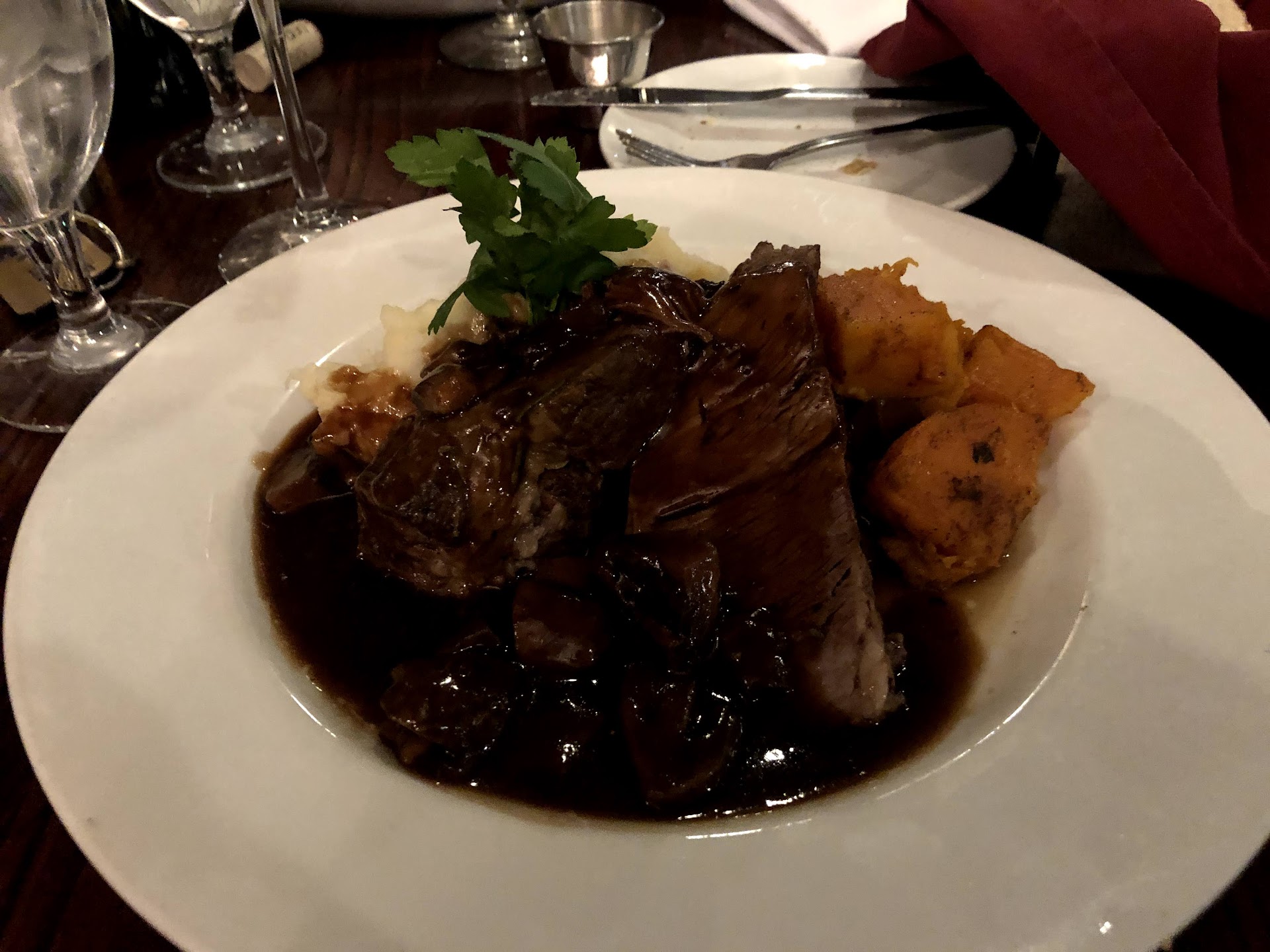 The layout inside is a bit of a maze, and though I initially followed signs to Liberty Row, a large event had the space fully booked. A kind gentleman working there directed me to Merchants Row, where I found a seat at the bar, ordered a Guinness, and went with their Yankee Pot Roast.