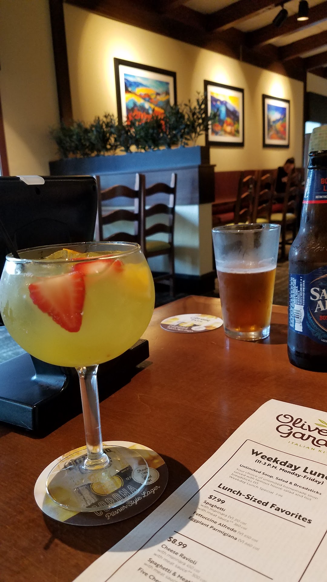 Ok, but not outstanding. I went with someone 4 their birthday. We were seated right away. The hostess was nice enough 2 ask "booth or table?". We chose booth. We were seated in a corner wall booth, which I liked, 4 the slightly more privacy factor. The waitress was very over eager 2 point out things on the menu, b4 we could peruse it ourselves. She asked if we wanted a wine sample, when I was with an 18 yr old, which annoyed & shocked me. At any rate, I ordered the unlimited, soup, salad & bread sticks. I ordered the salad, without onions, olives or tomatoes, which I don't like. They even omitted the pepperocini peppers too, even though I didn't mention them. I didn't want them either, so that was fine. IF YOU DON'T WANT A SOGGY SALAD, ORDER THE DRESSING ON THE SIDE. They only have ONE dressing choice, their "signature" Italian. I don't like Italian dressing, so I brought my own, some vegan Ranch dressing, that I had made, & vegan croutons, so, I was able to enjoy it anyway. The "unlimited" salad, only amounted to 3 sparse servings, or 2 moderate servings, per initial bowl. Also, I asked 4 fresh broccoli (the only other vegetable, that they offer) 2 put in my salad since I omitted so many other vegetables from the salad. They charged me $2.99 for the broccoli, which annoyed me. I also asked 4 some carrots, 2 put in the salad. 1st she insisted it wasn't possible, but then she came with a small plate of some. She nearly contaminated the salad, by zealously exclaiming "would you like some cheese?" (from a grater) I rushed 2 cover the salad, & said "no" as she continued 2 offer the cheese 2 my friend, who also said "No". I also smuggled in my own vegan butter, 4 the bread sticks. The 1st order of "unlimited" bread sticks, contained 3 bread sticks. The 2nd round of "unlimited"' bread sticks, contained only TWO bread sticks. I feel a little jilted because there weren't 3 bread sticks, like in the 1st round. I had looked up online, about what sides they offered, & found recipes, 4 roasted potatoes, Risotto, Creamy Polenta, Green Beans with Tomato & Garlic, Marinated Peppers, Roasted Corn & Tomato Salad, White Bean Salad with tomatoes & Crispy Pancetta, & Garlic Mashed Potatoes. When we looked at the menus, we could find NO SIDE DISHES LISTED ANYWHERE! I asked about the potatoes, & she said they no longer have any roasted potatoes, but she thought they still might serve the Garlic Mashed Potatoes. When she confirmed this, I ordered some for $2.99. I got a big scoop of them, about the size of a baseball. They were so good, especially with some of the vegan butter I brought. They were probably not vegan though. So, if you're vegan, Olive GARDEN offers very little 4 vegans 2 eat. Oh, I got the "unlimited" Minestrone soup, which IS vegan, & was good, with many vegetables. But, 4 "unlimited", I could only consume 2 bowls. My friend, a vegetarian, had more options, as virtually every dish has cheese in it, or on it. I was so engrossed in my salad, that thank goodness I didn't notice the Frank Sinatra "music" that was playing, that my friend told me about later. That's not exactly Italian atmospheric music. So, I never really felt comfortable there. Why is it so hard 4 eateries 2 come up with naturally vegan options that everyone can eat, & then have cheese, or non vegan dressings, or whatever, as add ons? There are 1,000s of edible plants, & millions of ways 2 combine them, but eateries, can't seem 2 come up with anything, except, pasta Marinara, bread, potatoes (some mashed potatoes, aren't even vegan), & "garden" salads. SO, we've "been there, done that", but probably won't do it again. More options, give more people a reason 2 go back, 4 something DIFFERENT. There's no point in going again, 2 always have the same exact thing because there r no other options. The $10.99 pasta plate was HUGE, probably about 5 cups of pasta, enough 2 feed 5 people conservatively. They DO allow "boxing" of what u can't finish, &...